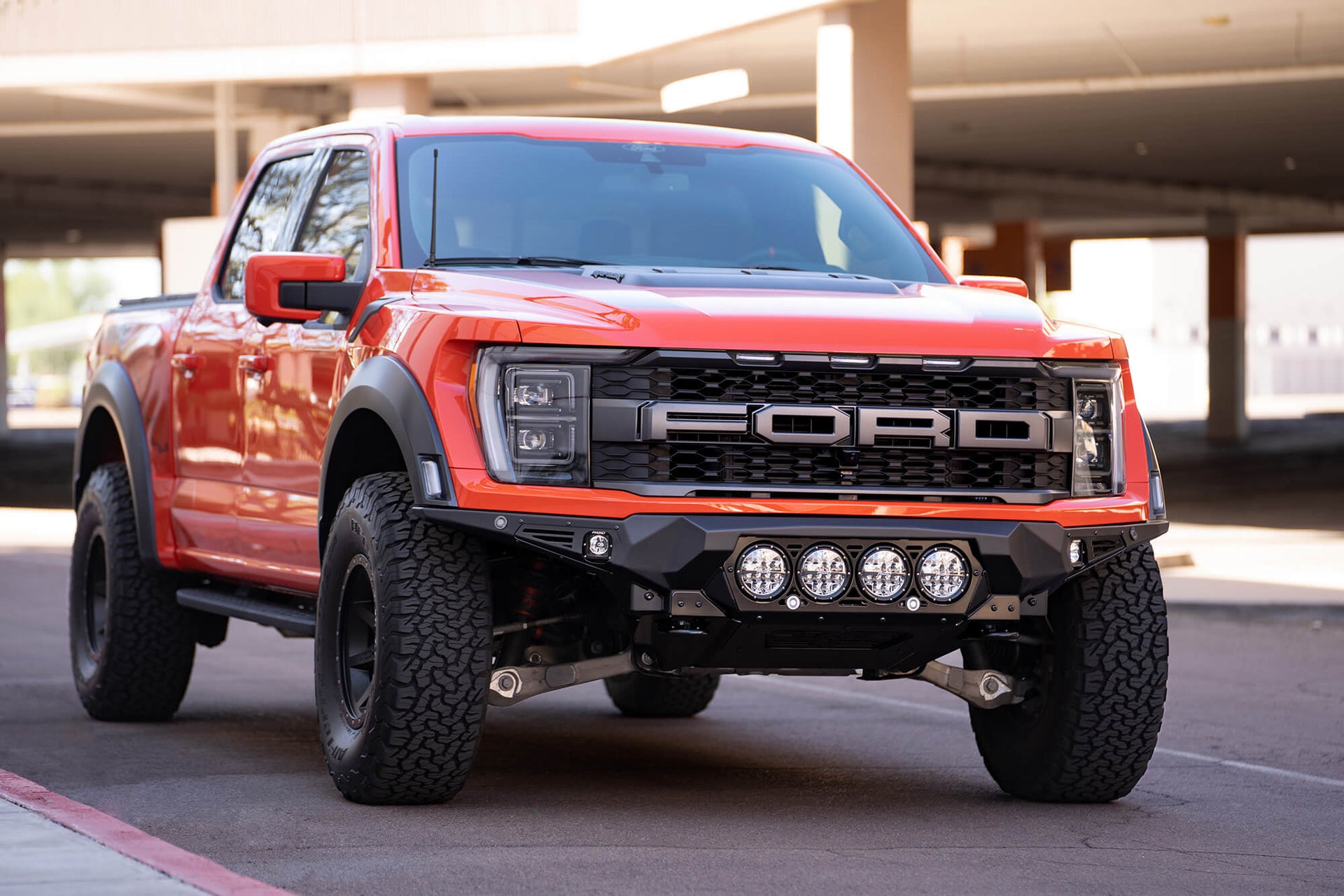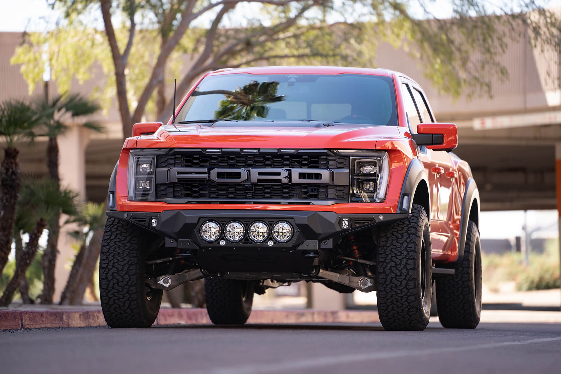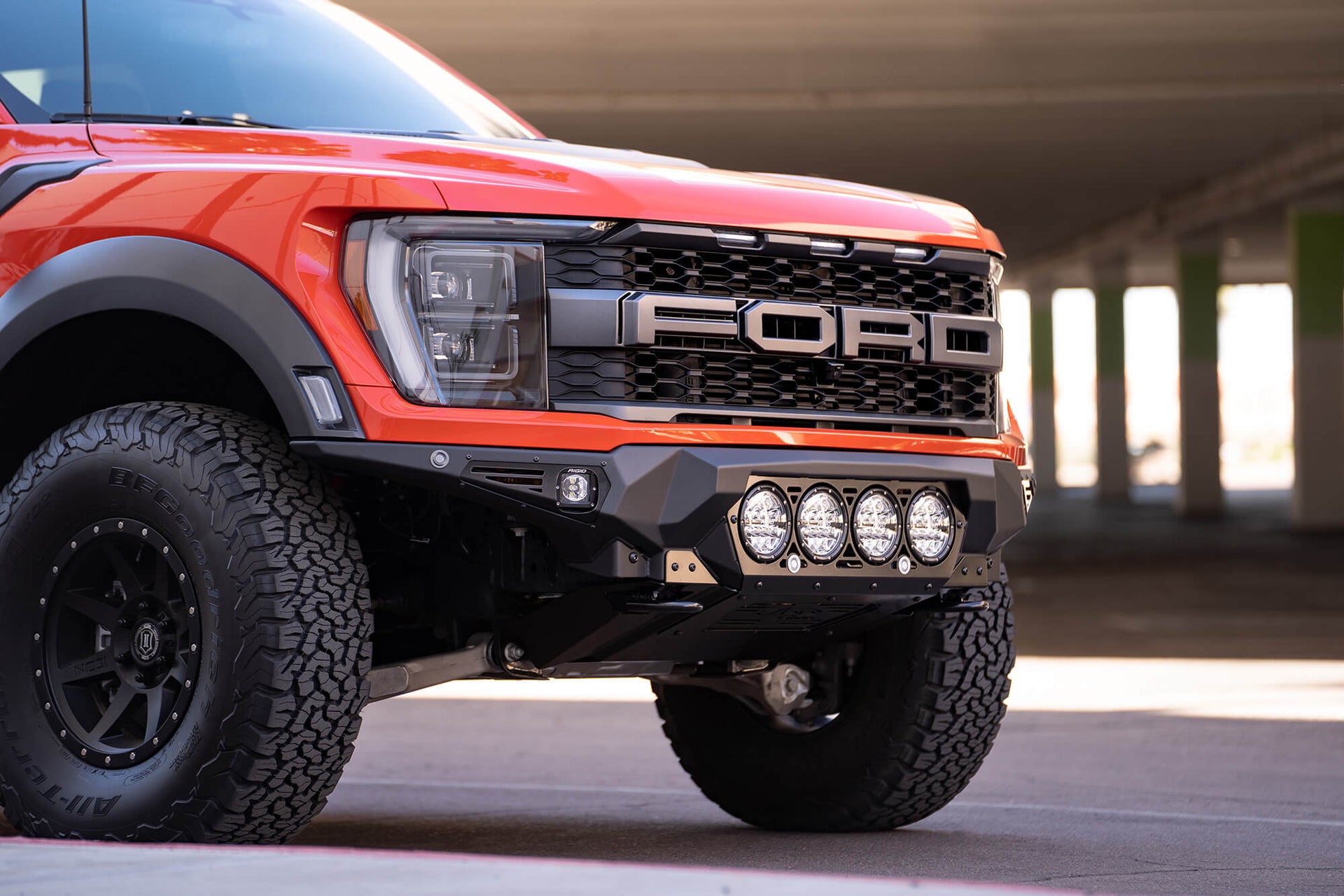 The ADD Offroad Bomber Front Bumper for the Ford Raptor & Raptor R has been the king of aftermarket Raptor bumpers for years. We’ve brought the Bomber to the 3rd-gen Raptor, keeping it true to it’s low-profile, aggressive styling. Constructed from plate steel and lightweight aluminum panels, the Bomber provides protection to your truck’s front end without compromising clearance. The 3/16-inch aluminum skid plate helps to ensure that the Bomber is lighter than the OEM bumper.