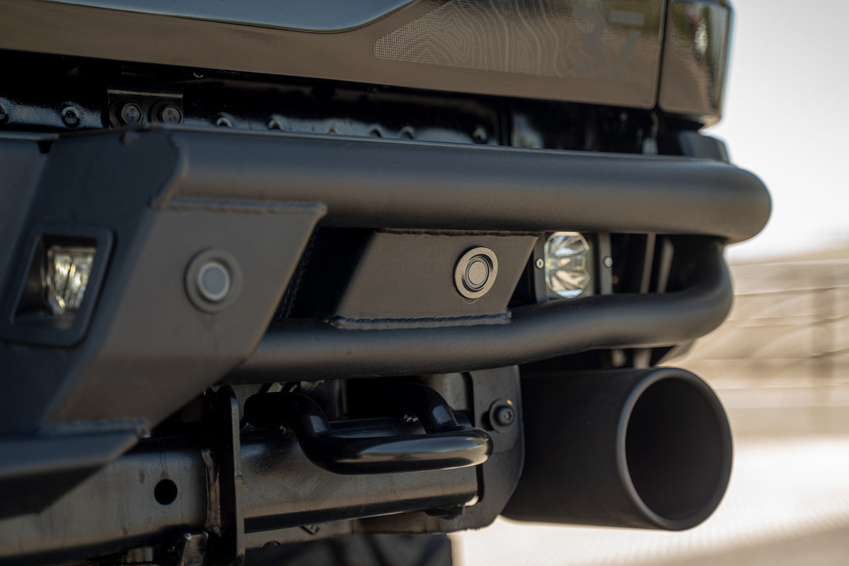 There are pod light mounts towards both ends of the bumper, where 3" LED cube lights can be installed. These could be wired to the reverse lights, or to a separate harness for supplemental lighting while driving off-road. The Pro Bolt-On Raptor rear bumper retains all OEM features such as the reverse sensors, license plate lights, hitch & trailer harness, and tow hooks. As always, this is fully bolt-on and Made in America.