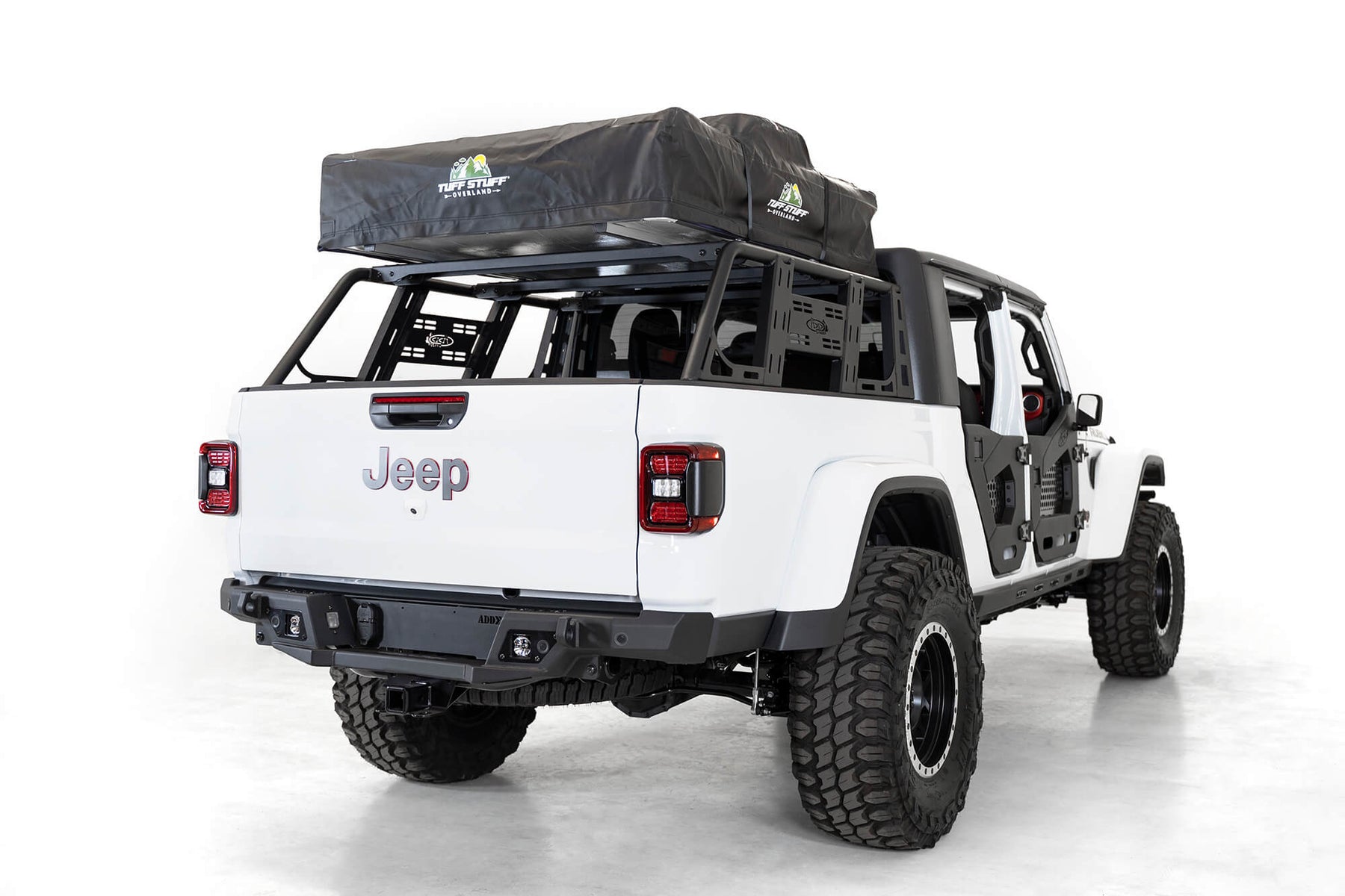 Addictive Desert Designs ADD-Lander Overland Rack for the Jeep Gladiator JT takes form and function to a whole new level. The rack uses a combination of tube and plate steel to create a unique look. The side rails and center cross members offer a series of slotted mounting holes to allow the use of almost any off-road accessory. The overland rack is extremely sturdy, allowing the use of heavier items up top, such as rooftop tents. The Jeep Gladiator in bed rail system is used as a mounting point, meaning there is no drilling or cutting required for installation. As always, this product is made in America.