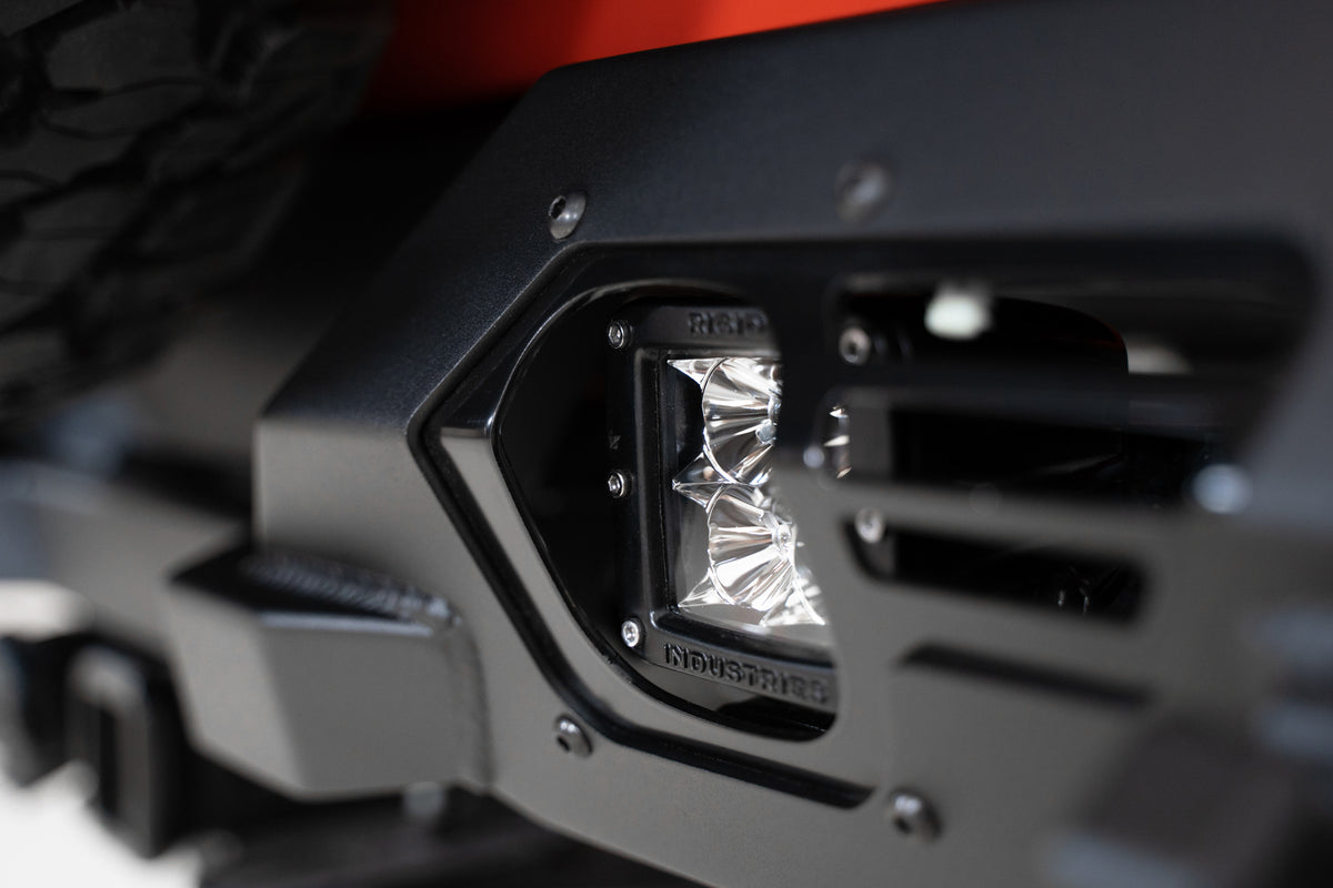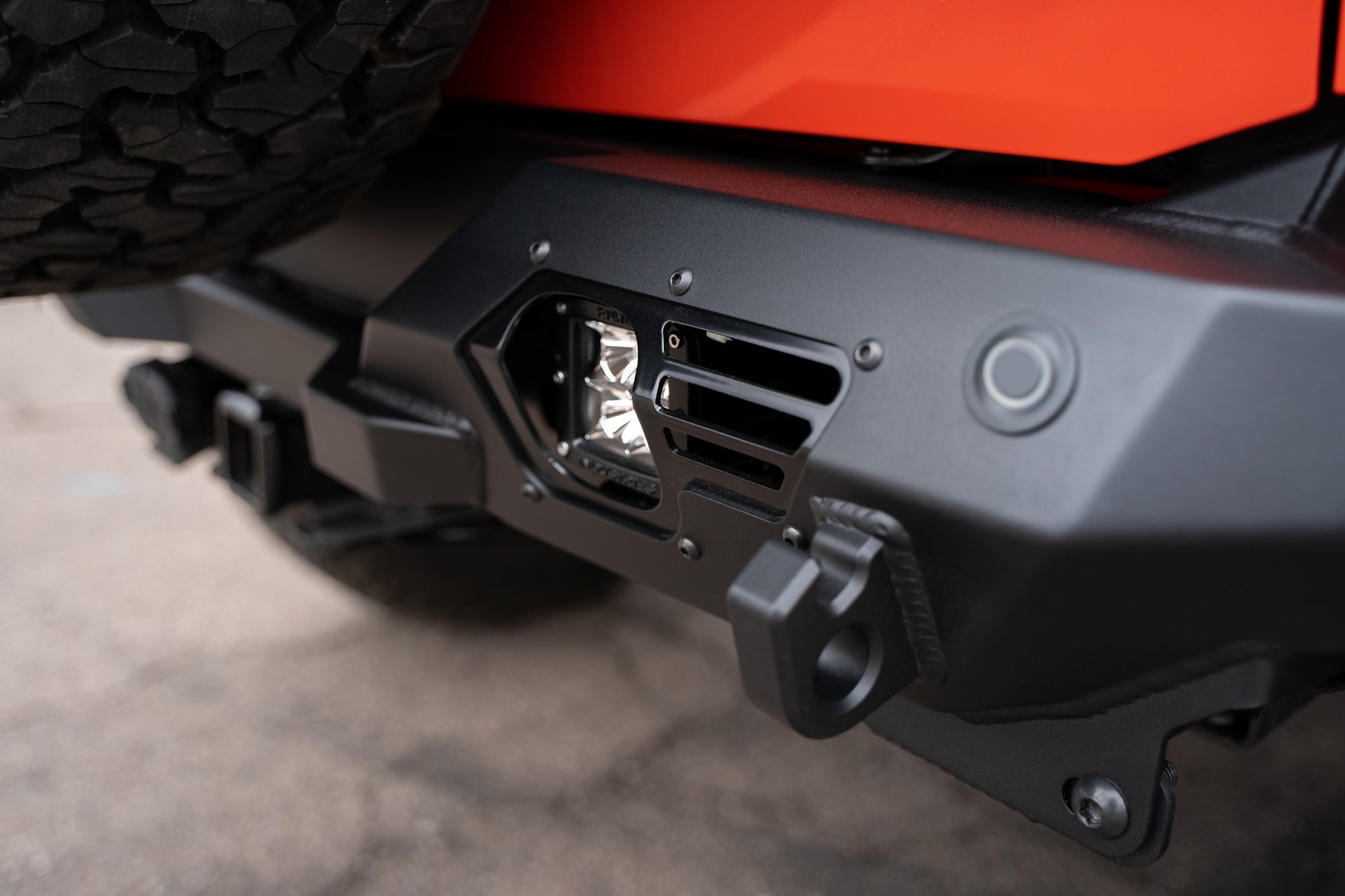 When you install the Bomber Rear Bumper, you retain full functionality of your parking sensor system and keep convenient access to your OEM tow hooks below the bumper's sleek frame. What's more, a license plate bracket is included with the bumper so you can relocate your plate above the bumper, and is bolted into the same mounting points as the spare tire carrier - a subtle yet stylish detail. As always, this is fully bolt-on and Made in America.