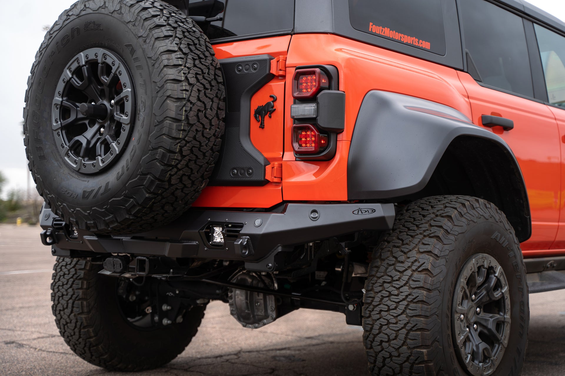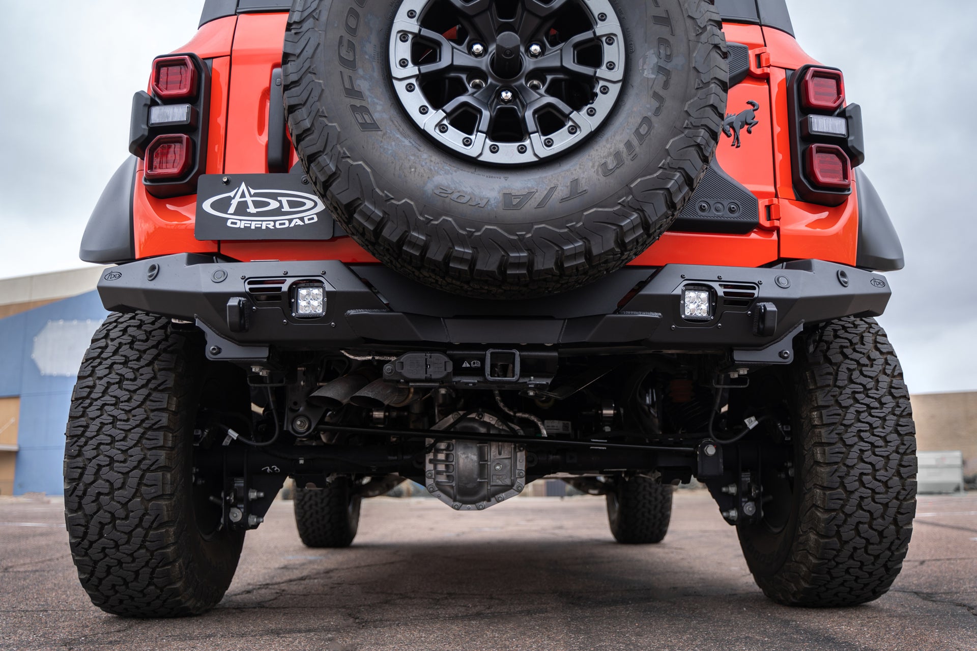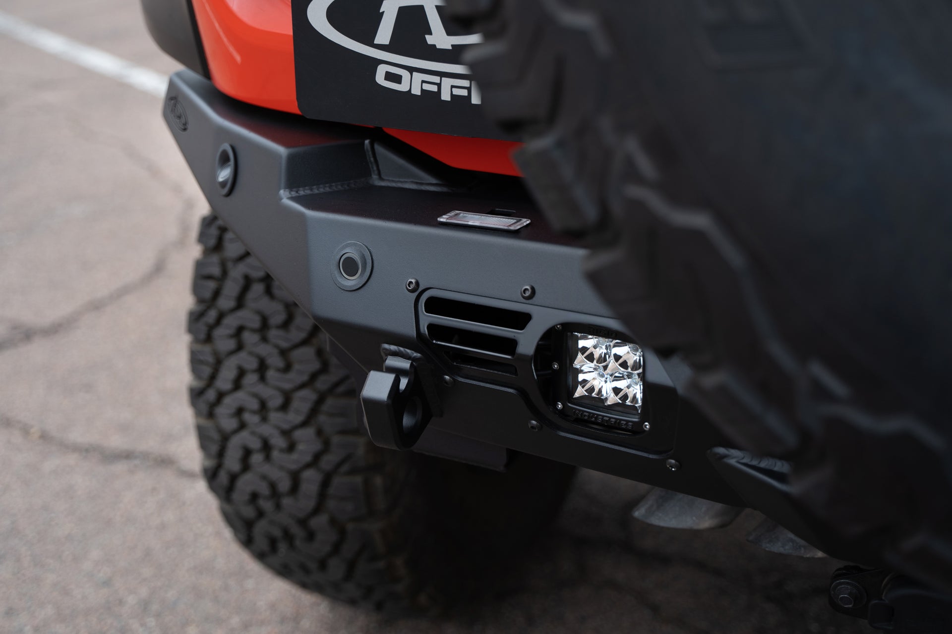 ADD Offroad's Bomber Rear Bumper's slim-fitting design offers a unique, low-profile look that adds a style to your off-road build. Crafted from plate steel and featuring a hammer black powder coat finish, this bumper is strong and durable enough to take on the toughest trails. The lightweight aluminum alloy panels are finished in a stunning satin black powder coat for an eye-catching aesthetic. The Bomber also features two heavily reinforced clevis mounts for soft shackles, bringing functional recovery options straight to your Bronco Raptor. There are 2 universal mounting points for cube lights towards both ends of the bumper that can provide supplemental lighting at the rear of the truck.