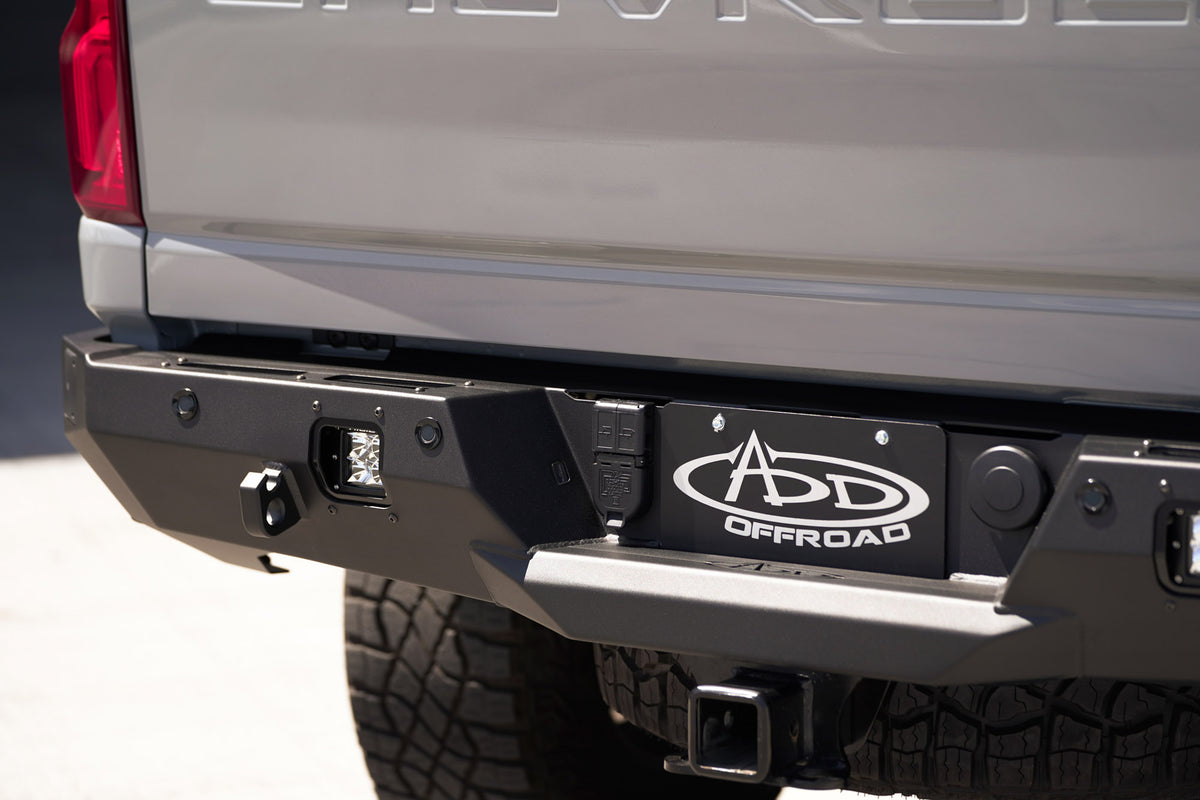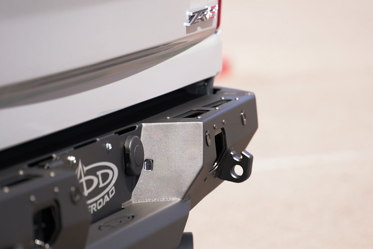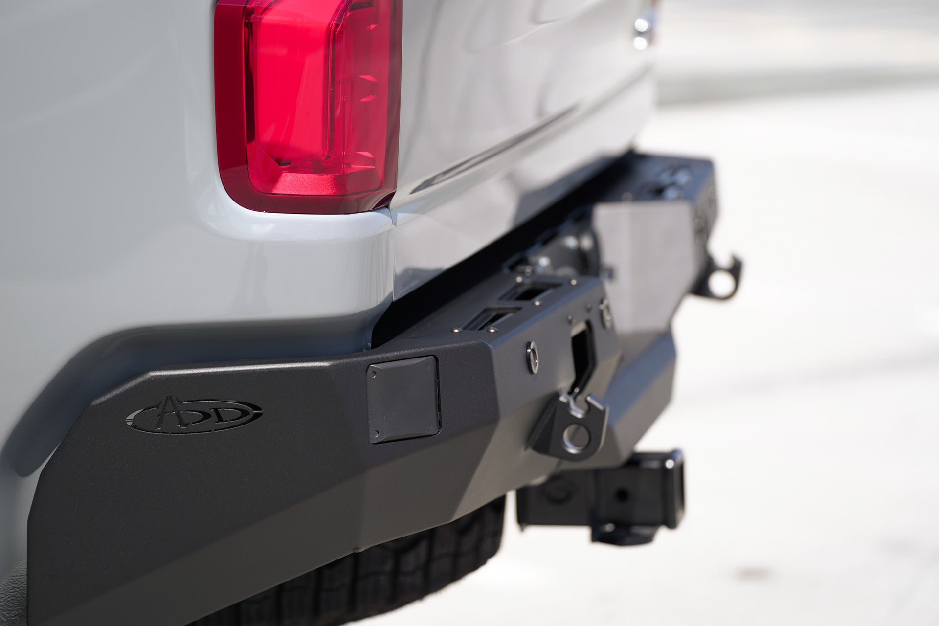 The Phantom Rear Bumper is made from durable steel, and the dual-stage hammer black powder coat and satin black aluminum accent panels offer a sleek finish. The bumper is designed to closely follow the contours of your truck, for a seamless fitment that also retains the OEM parking sensors and trailer plug & wiring. This ADD Offroad rear bumper is proudly made in the USA.