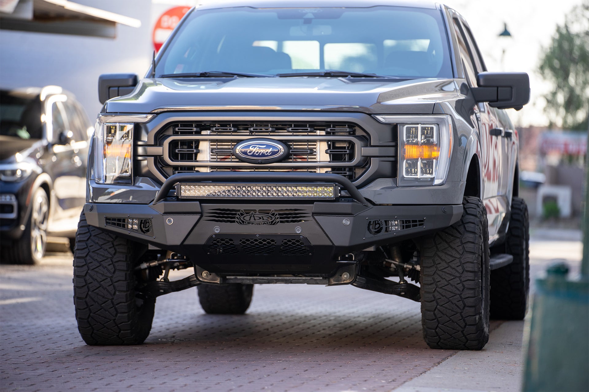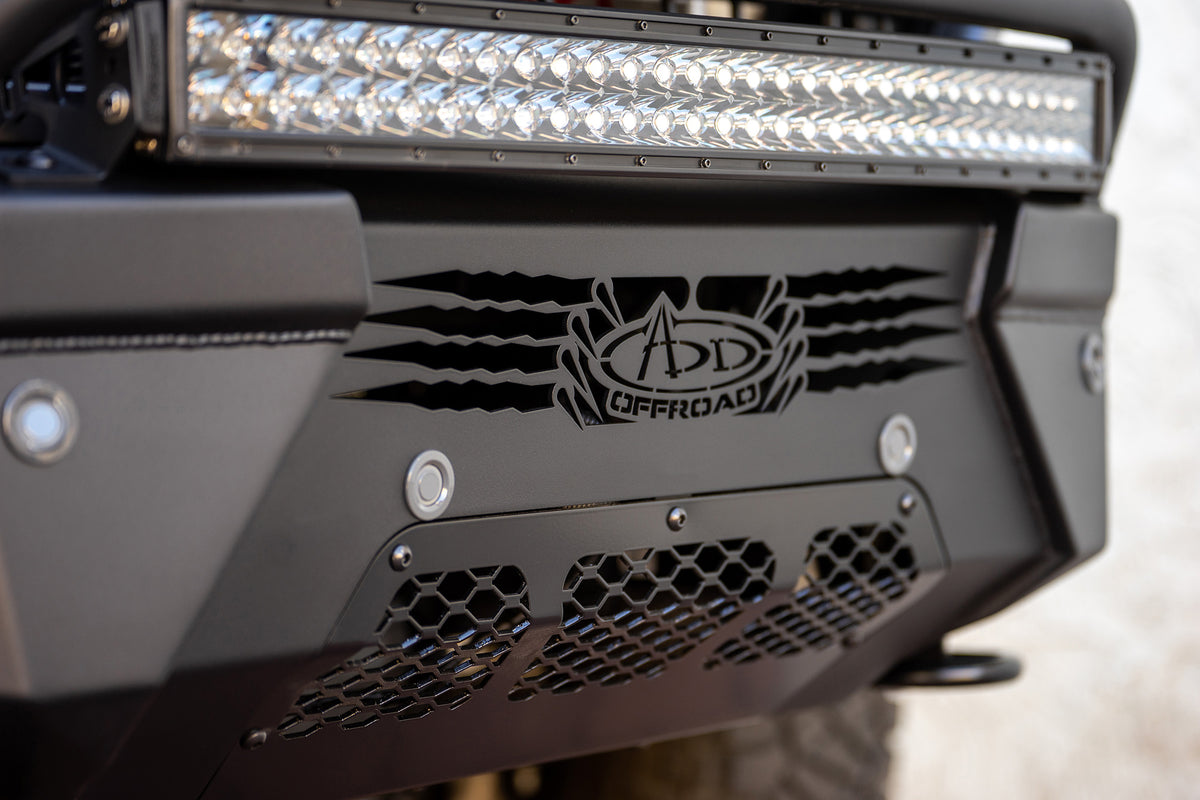 The newly redesigned Addictive Desert Designs HoneyBadger Front Bumper keeps the same rugged styling as the original but with a low-profile fitment. There is an optional top hoop, but either configuration has room to mount a radius 30" light bar on top of the bumper. The center of the bumper houses a straight 20" light bar, and two cube lights can be mounted behind the side panels.