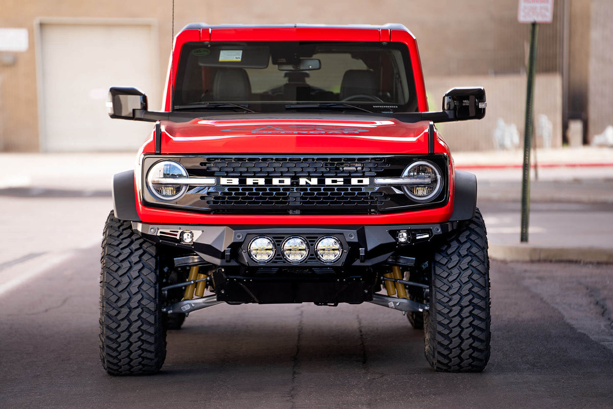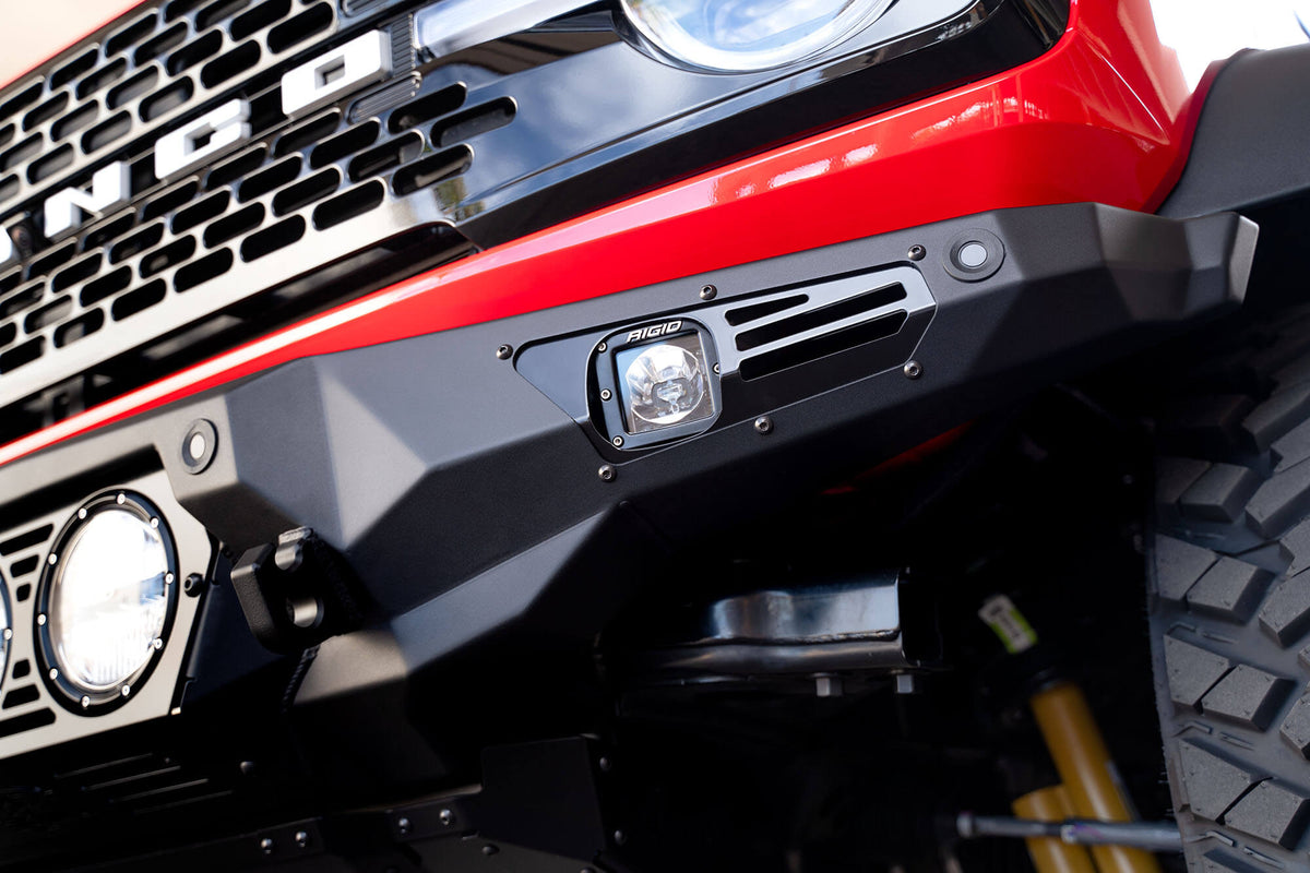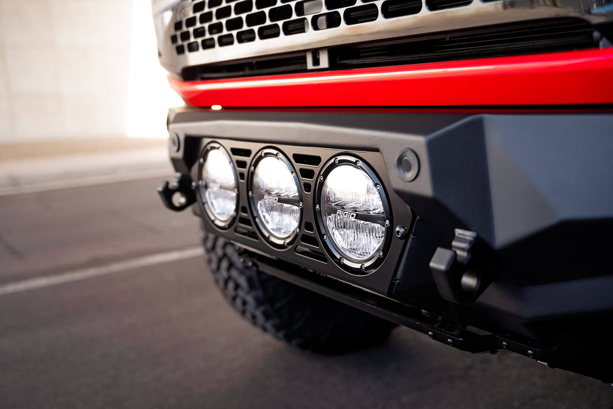 The Bomber is a tight fitting front bumper for the new Bronco, that follows the contours of the body perfectly. At the center of the bumper, is a satin black aluminum panel that frames 3 mounting points for Rigid 360 6-inch lights (also available with Baja Designs Lighting. At the sides of the bumper are mounting points for cube lights, framed by satin black aluminum panels. The Bomber is constructed from modern plate steel, finished in a hammer black powder coat. The aluminum panels are finished in a satin black powder coat.