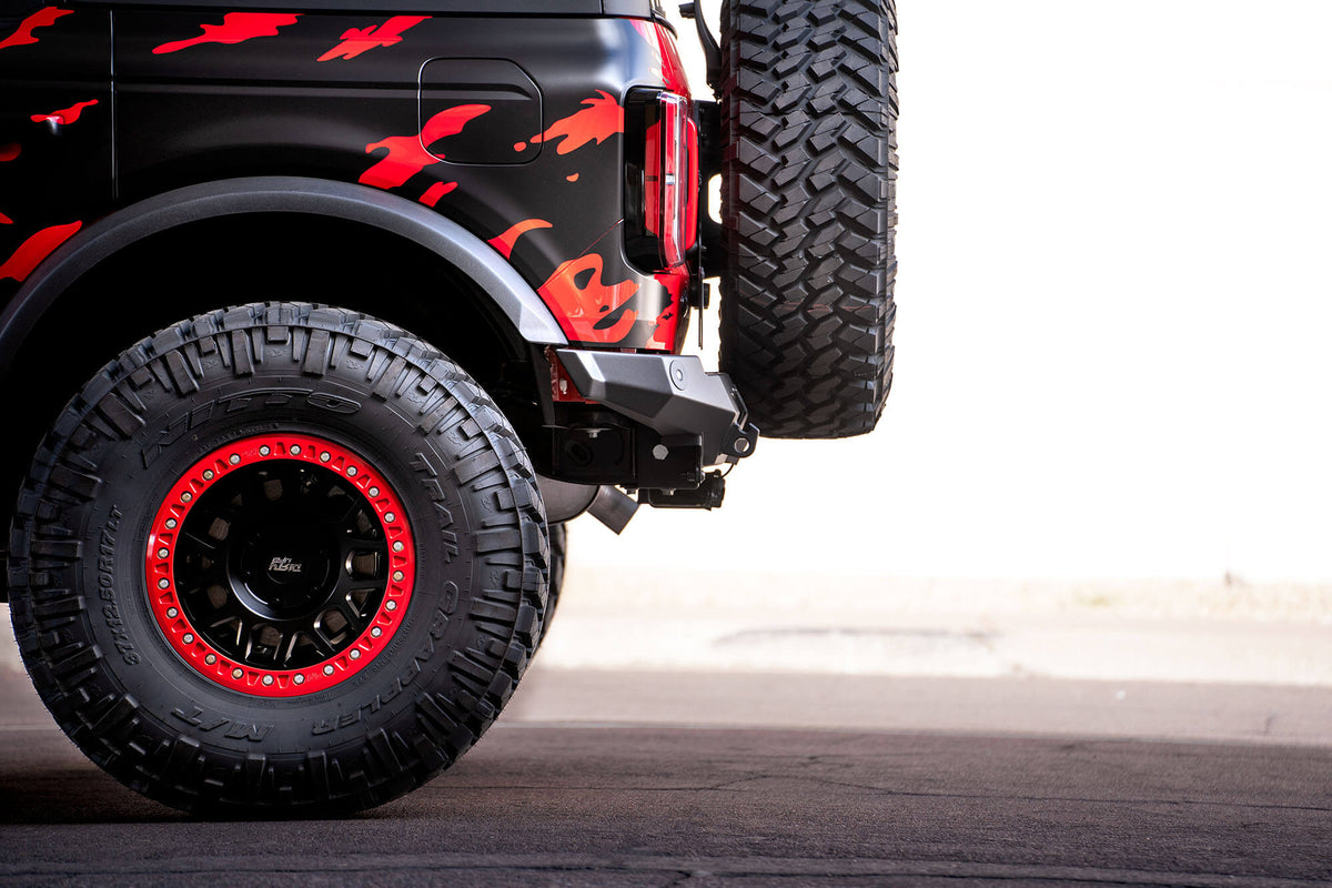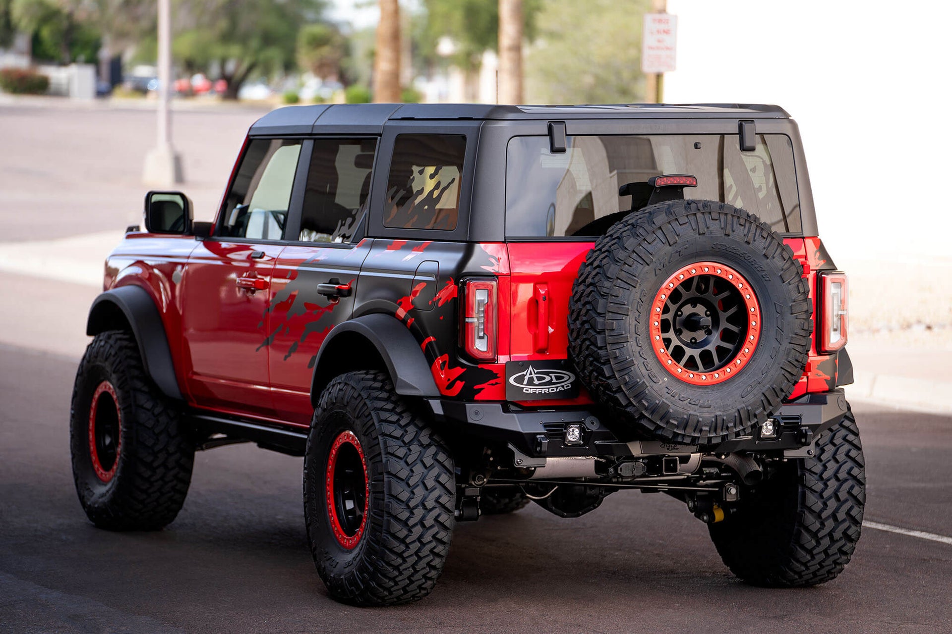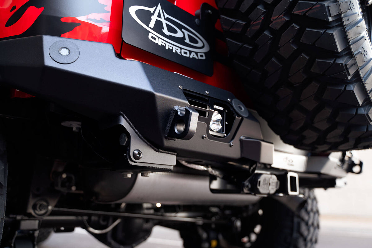ADD Offroad's Bomber Rear Bumper for the Ford Bronco is a low-profile and slim fitting bumper that closely follows the body lines of the Bronco. The Bomber is constructed of modern plate steel with a hammer black powder coat finish, and lightweight aluminum alloy panels with a satin black powder coat finish. There are 2 universal mounting points for cube lights towards both ends of the bumper that can provide supplemental lighting at the rear of the truck.