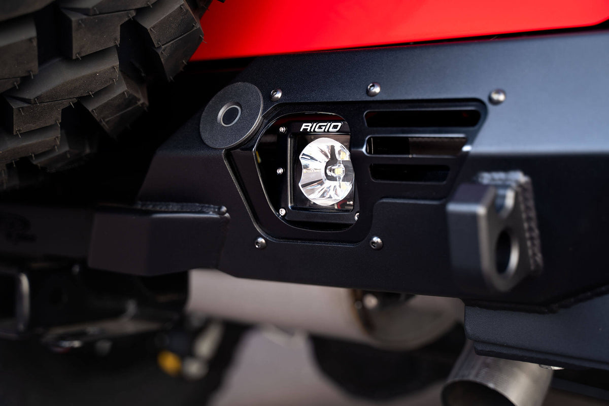 The Bomber features two heavily reinforced clevis mounts that accept soft to provide recovery options. The bumper also has sensor cutouts in order to retain full-functionality of the parking sensor system. The bumper sits just above the OEM tow hooks, allowing them to be used as intended. A license plate bracket is included with the Bomber that relocates the plate above the bumper, and is bolted into the same mounting points as the spare tire carrier. The OEM license plate light can be installed in this new location on the top of the bumper. As always, this is fully bolt-on and Made in America.