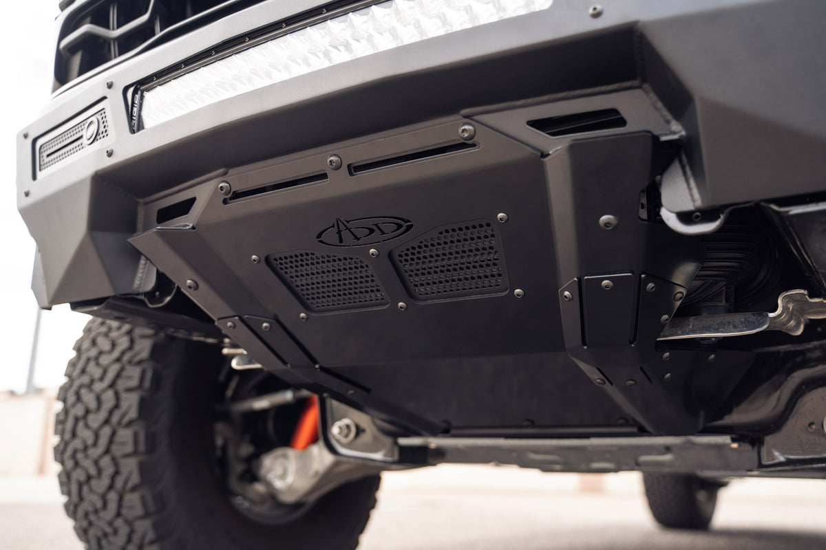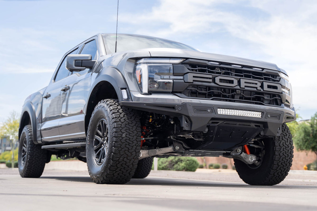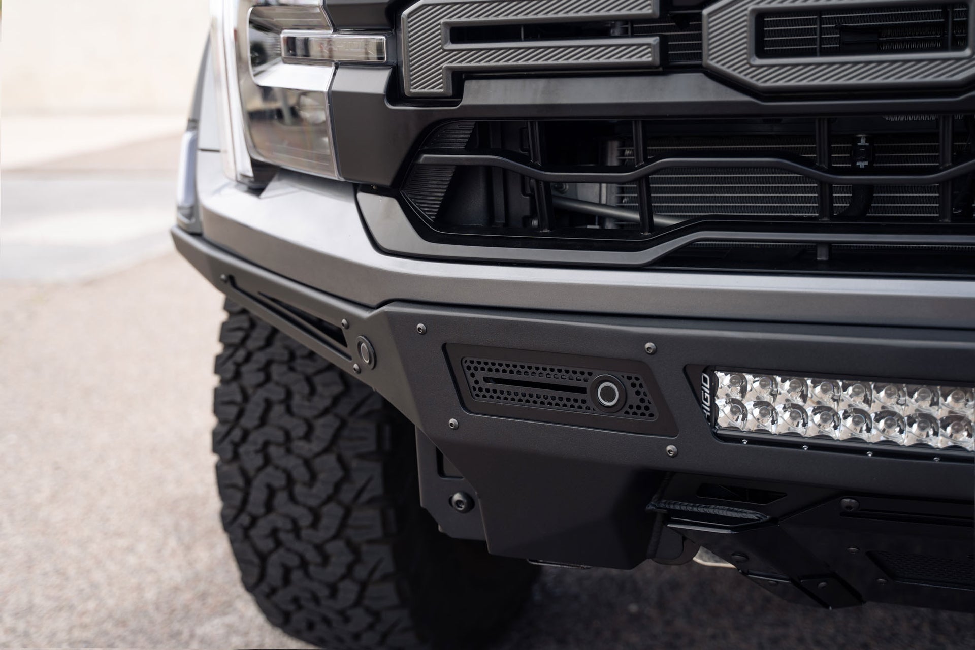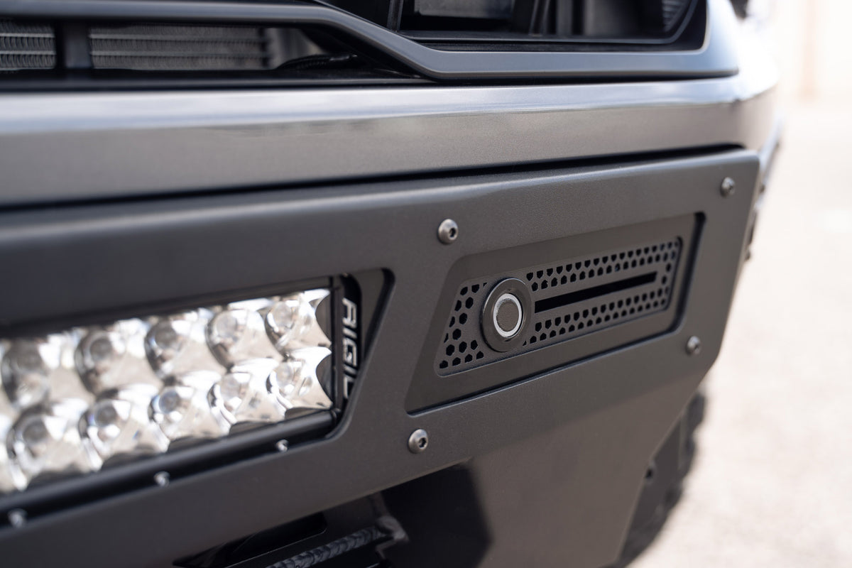 The Rock Fighter 2021+ F-150 Raptor Front Bumper is a pre-runner style plate steel bumper with a modern sleek touch. Turn heads with the satin black accent panels and seamless fitment while protecting the underbody of your Raptor with the included lightweight rust-proof 3/16-inch aluminum skid plate. Integrated air vents on the plate ensure there’s proper airflow to the intercooler.