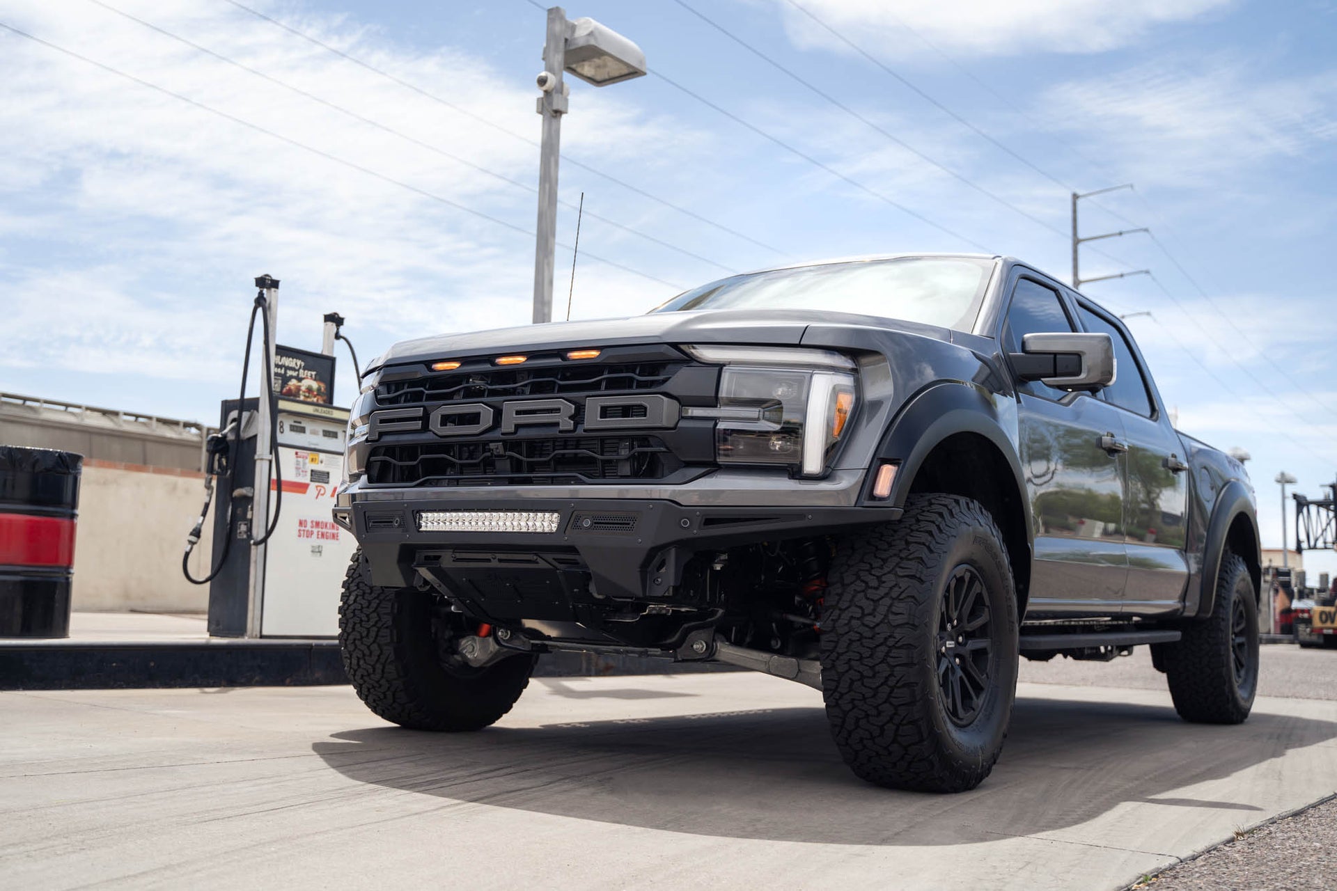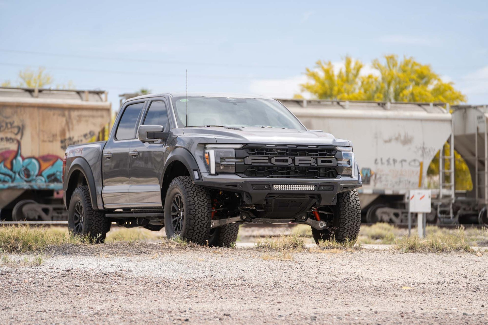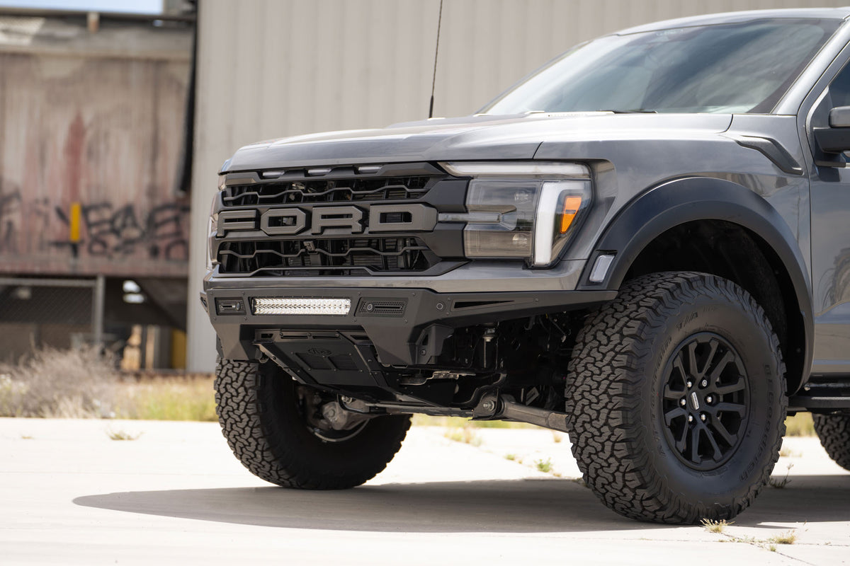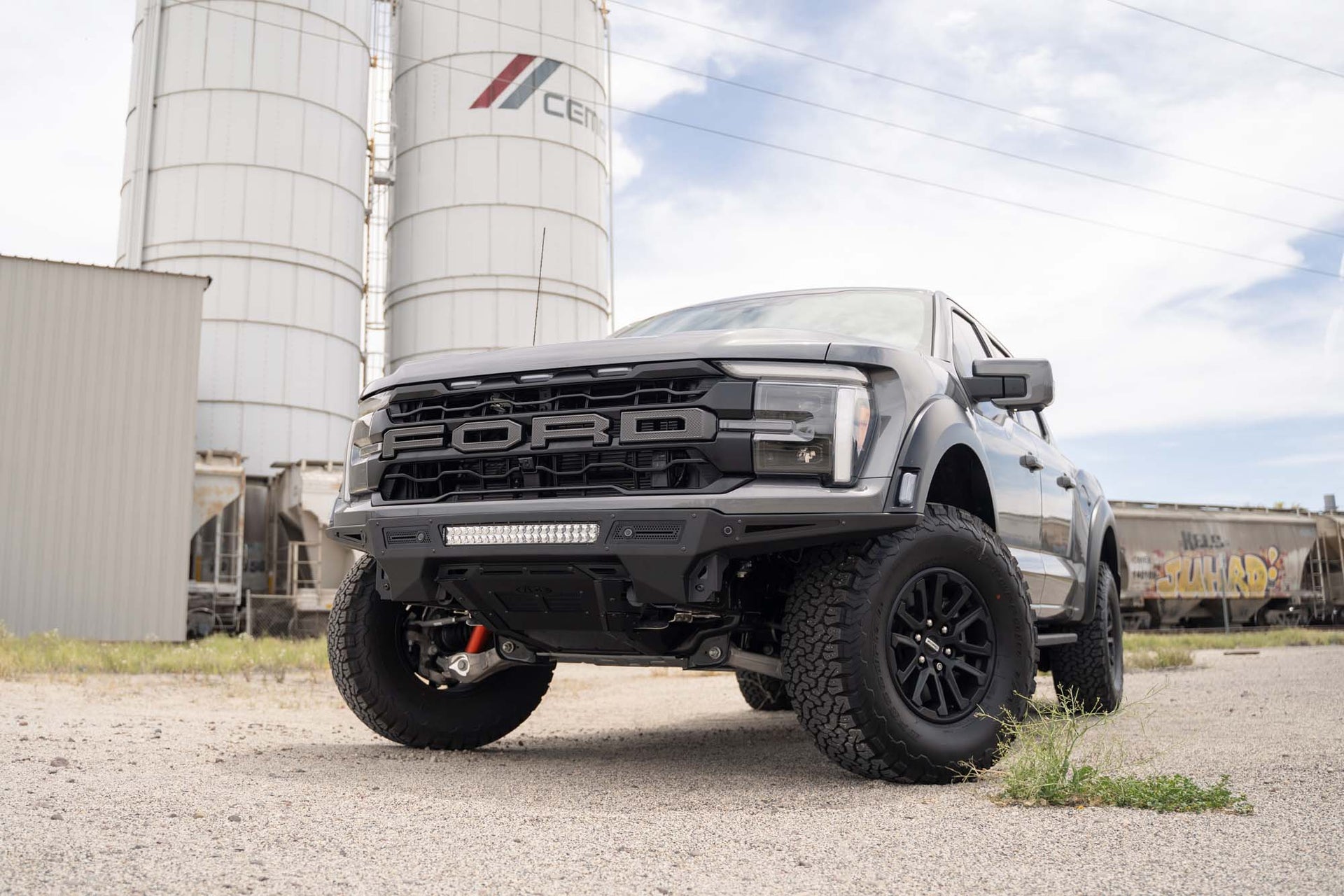 The Rock Fighter 2021+ F-150 Raptor Front Bumper is a pre-runner style plate steel bumper with a modern sleek touch. Turn heads with the satin black accent panels and seamless fitment while protecting the underbody of your Raptor with the included lightweight rust-proof 3/16-inch aluminum skid plate. Integrated air vents on the plate ensure there’s proper airflow to the intercooler.