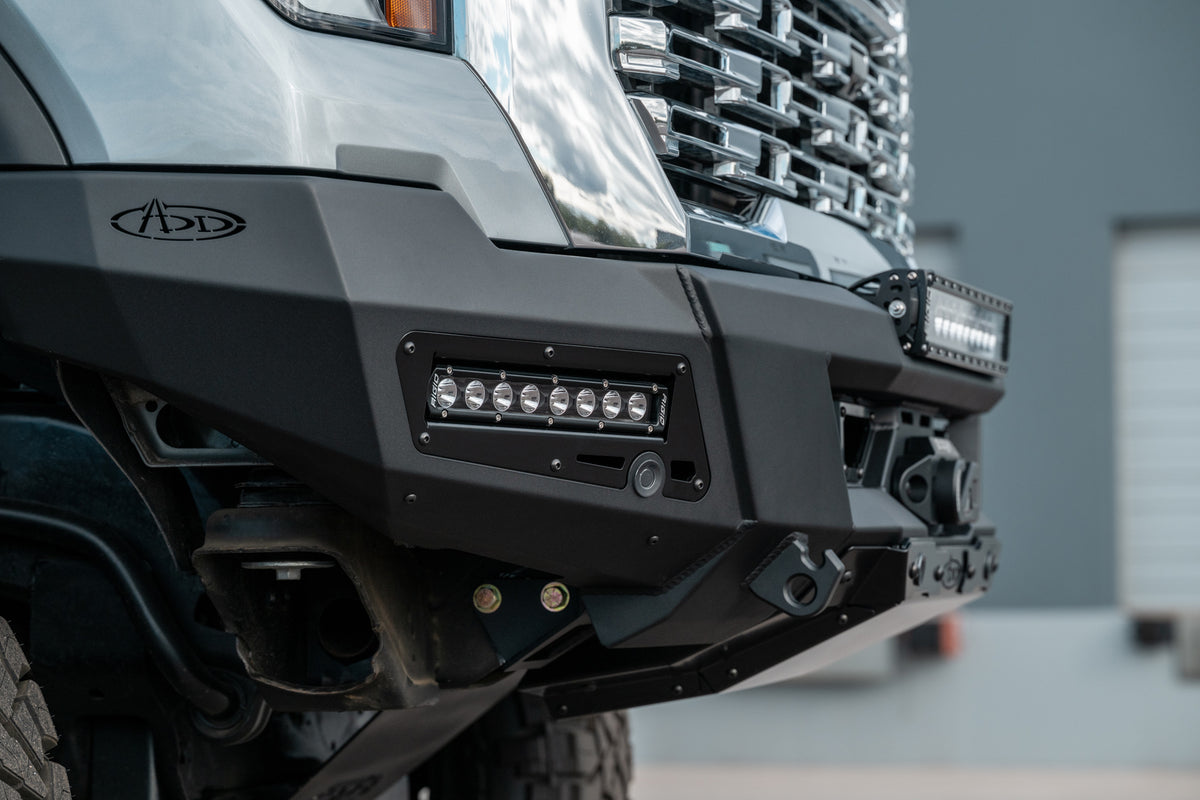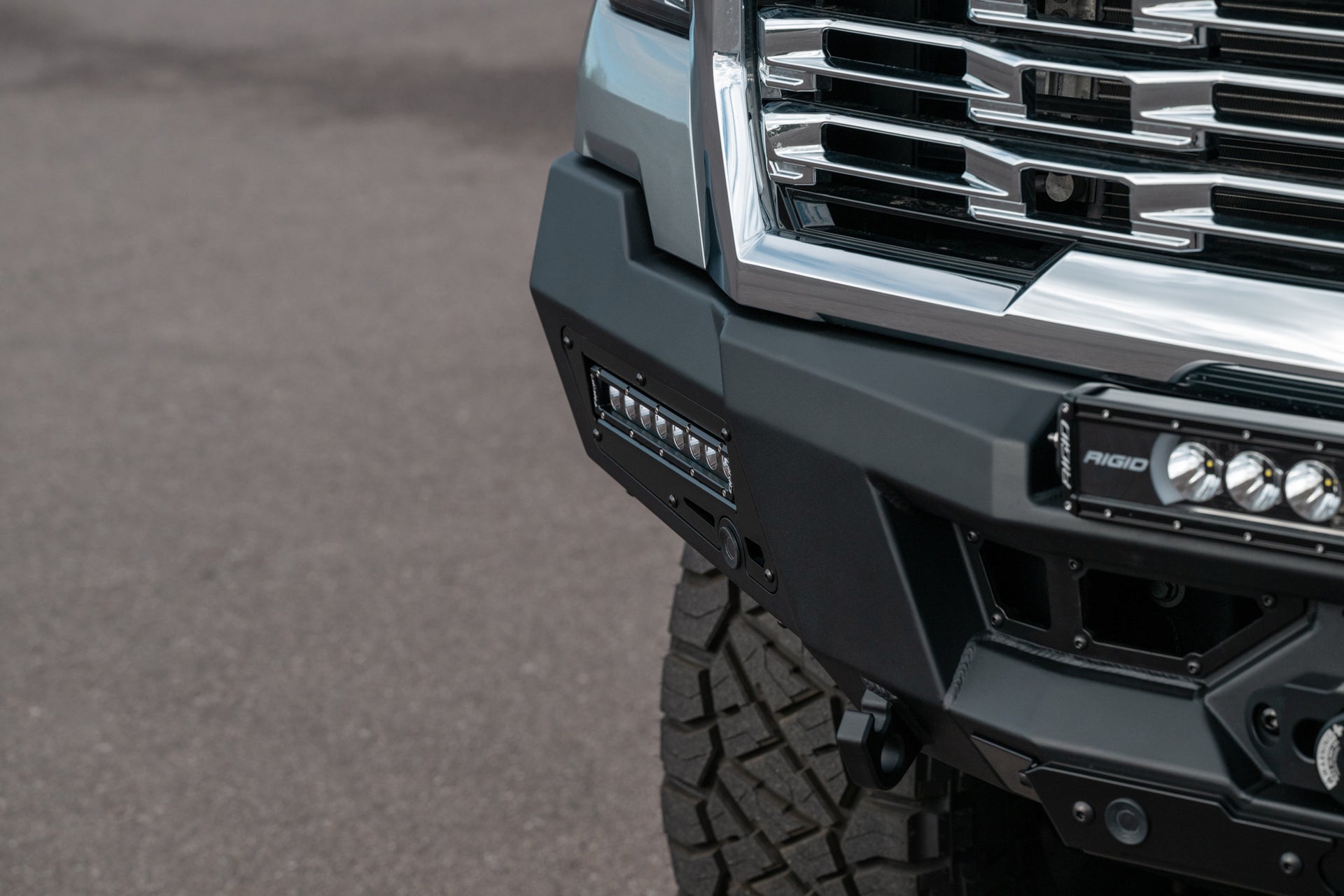 Our Phantom GMC Sierra Winch Front Bumper combines sharp lines and an unmatched fitment for an overall aggressive styling. It offers a top recessed light pocket that can mount one 20-inch light bar or six 3-inch cube lights for enhanced lighting. You can also run two 10-inch light bars on the sides for added styling and visibility at night. For those that need extra utility when on a work site or off-road, our front bumper provides a modular extreme-duty hidden winch mount that is easily accessible from the surrounding accent pockets. You can also mount a pair of D-Rings to the integrated 1-inch thick clevis mounts.