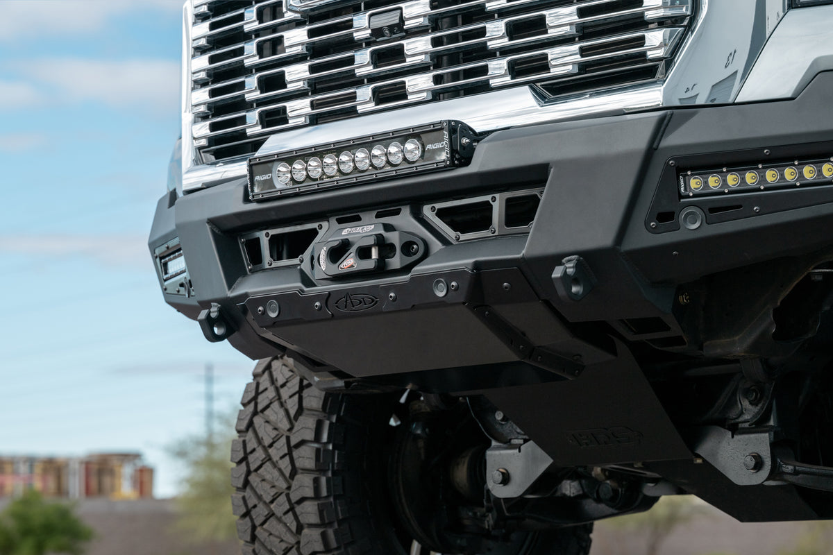 The Phantom Winch Front Bumper features a removable heavy-duty aluminum skid plate for extra protection to your undercarriage. For the perfect finishing touch, the bumper offers a dual-stage hammer black powder coat with sleek satin black accent panels. It is crafted from durable steel for the utmost protection from gravel, rocks, and other debris encountered on and off the road. The bumper retains your truck’s OEM parking sensors and adaptive cruise control. As always, our GMC Sierra HD Front Bumper is proudly made in the USA.