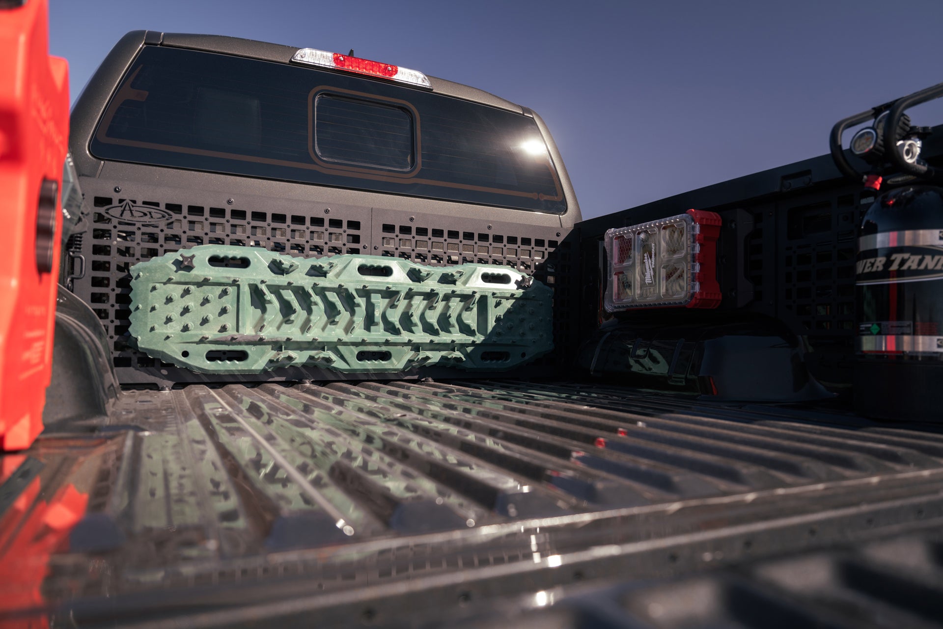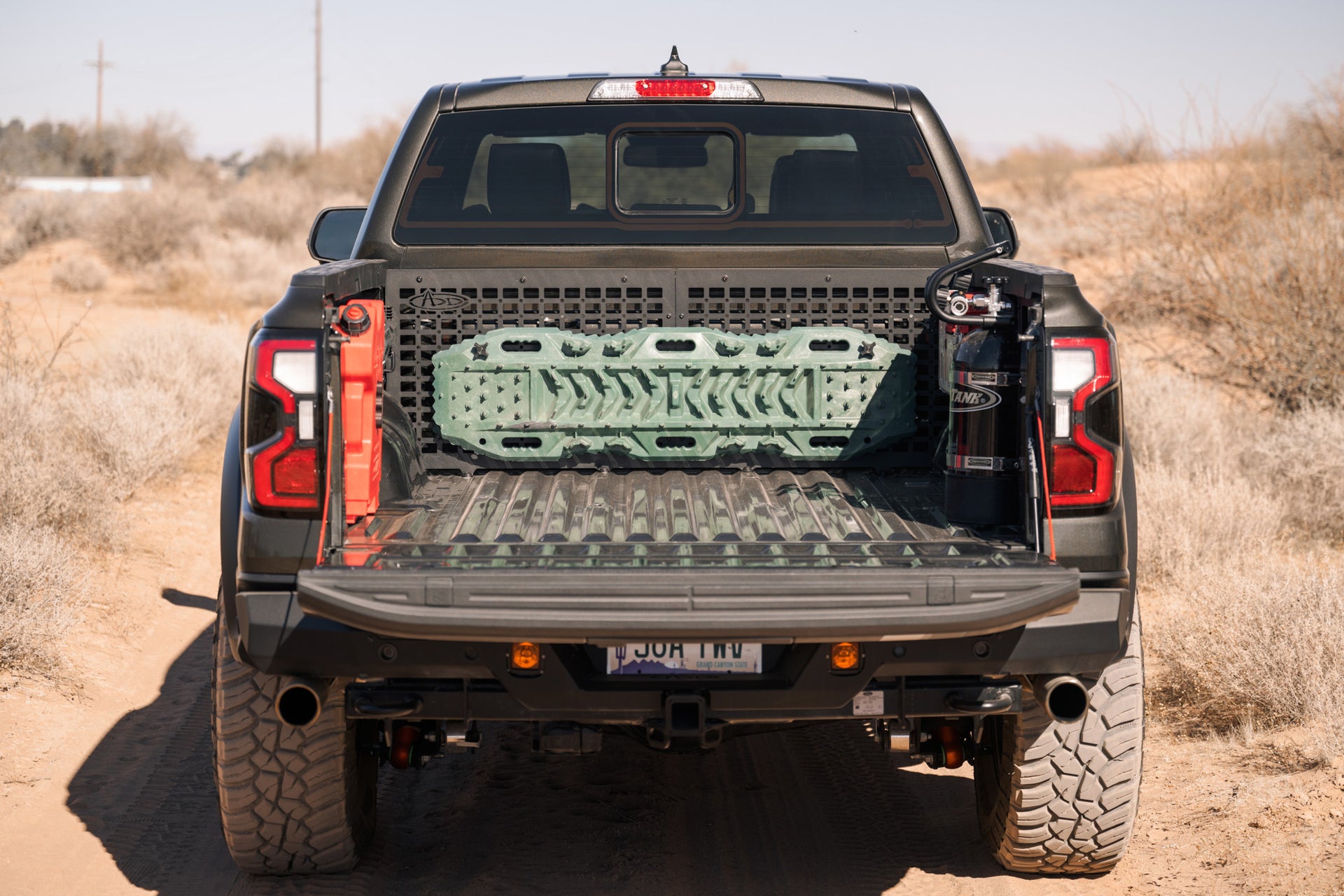 Our Ranger Raptor Bed Cab Molle Panels allow you to optimize your truck bed’s vertical storage space. You can securely mount shovels, axes, hoses, fire extinguishers, traction/recovery boards, jacks, and other off-road/recovery gear to the panels. They are compatible with straps, bolts, Quick Fists, and other molle attachment systems.