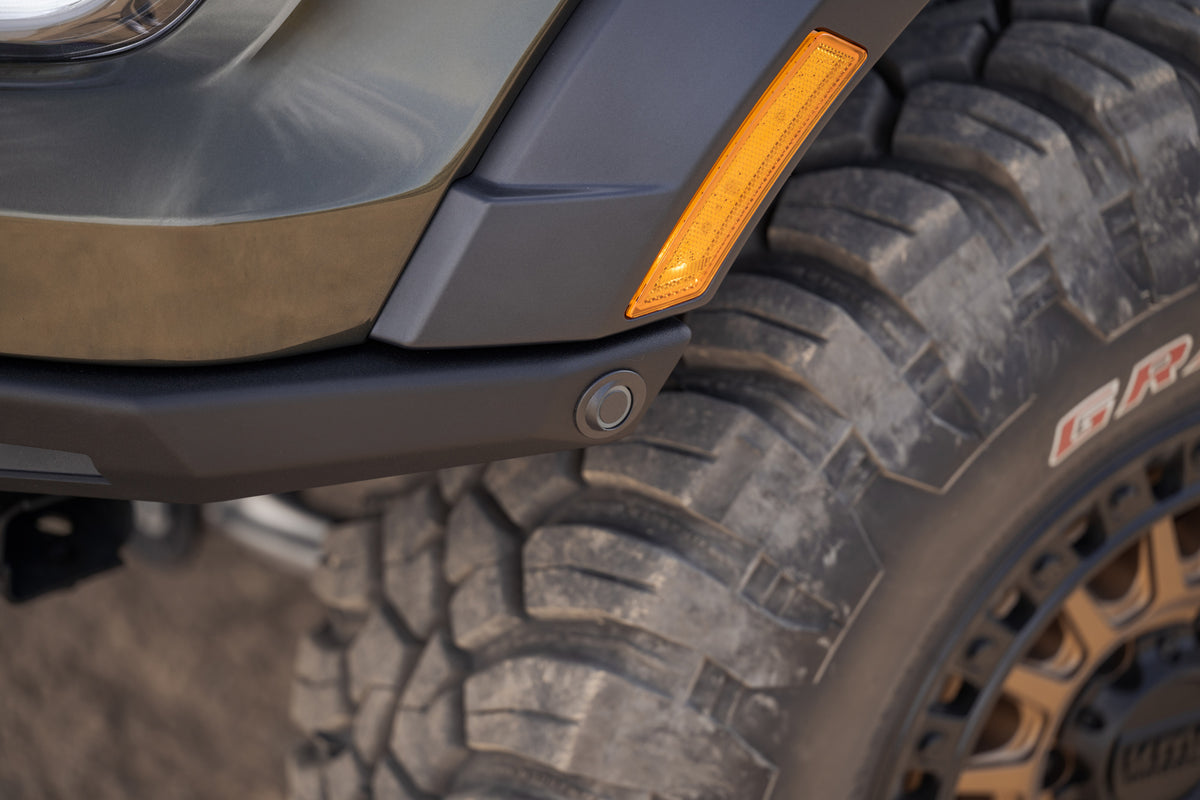 The Edge Front Bumper is completed with a removable heavy-duty aluminum front skid plate for protecting your Ranger Raptor’s undercarriage. The bumper retains your truck’s factory recovery points, parking sensors, driving assist features, and intercooler. For a finishing touch, it features a hammer black powder coat with satin black accent panels. Our bumper is made from steel for maximum front-end durability. Whether your tires are touching asphalt or dirt, The Edge will take your Ranger Raptor to the next level of excellence thanks to its razor-sharp styling and top-of-the-line design. As always, our bumpers are proudly made in the USA.