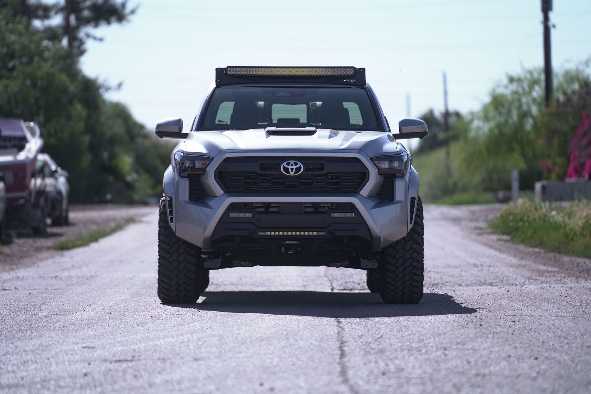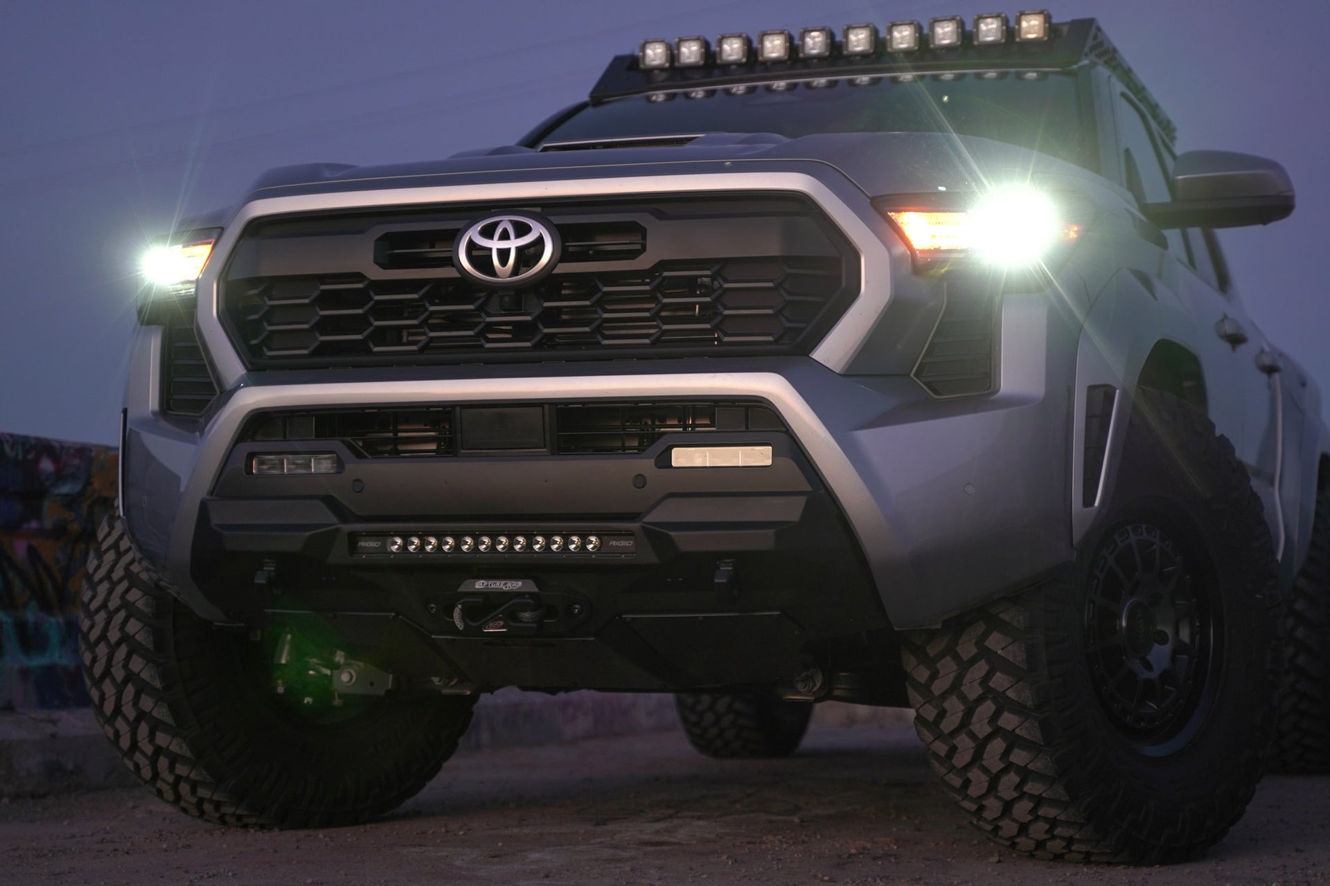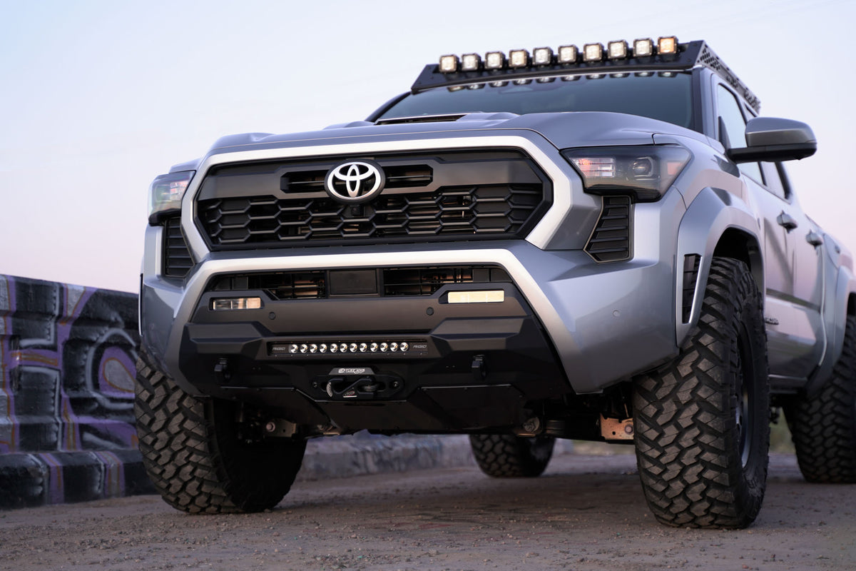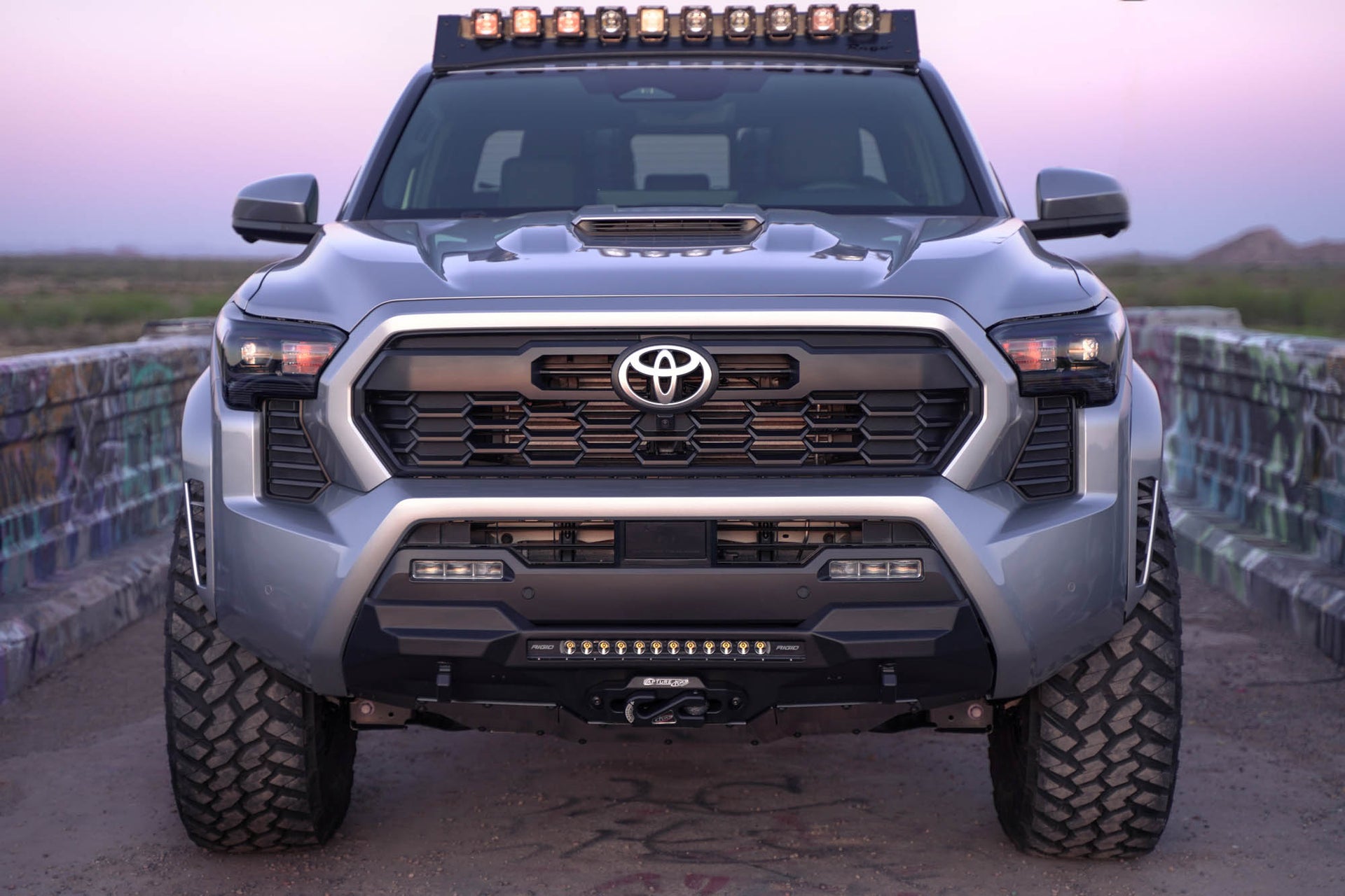 The Stealth Series 4th Gen Tacoma Center Mount Winch Front Bumper provides added durability and recovery options during off-road adventures and everyday travels. A universal mount for a single row 20-inch light bar in the center of the bumper gives you additional lighting options for navigating low-light terrain. Our bumper retains the OEM sensors, fog lights, and front camera view, while remaining compatible with adaptive cruise control.