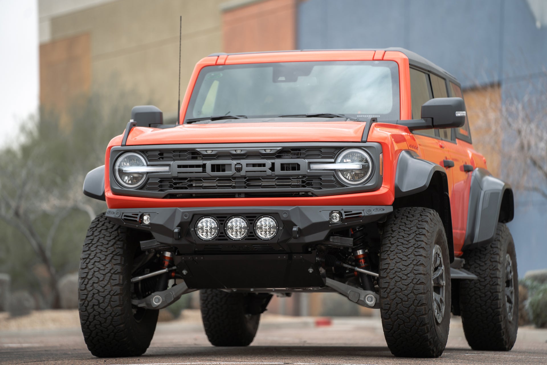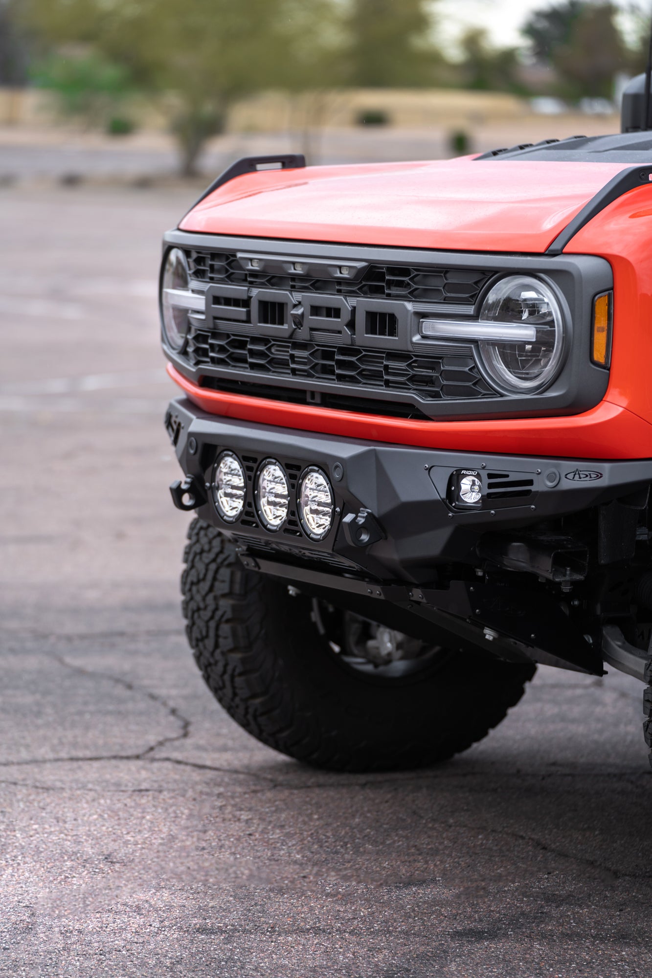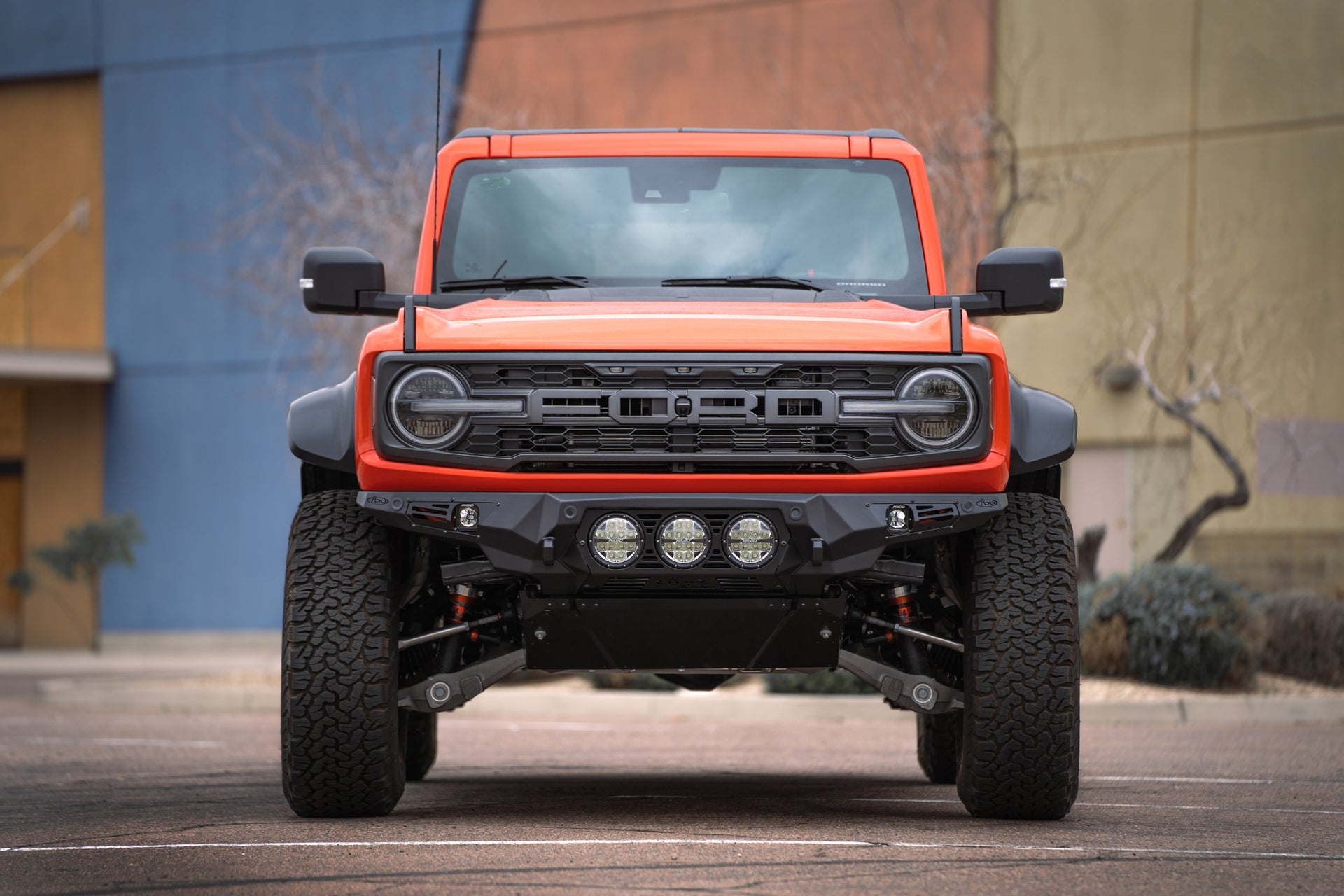 The Bronco Raptor Bomber Front Bumper was designed for those seeking an upgrade from their OEM bumper, without sacrificing any of their vehicle’s functionality. The Bomber can truly elevate the look of your Bronco Raptor, with its tight fit and satin black aluminum panels that frame three mounting points for powerful Rigid Industries 360 round lights. Cube light mounting points are also featured at the sides for added illumination on the trails.