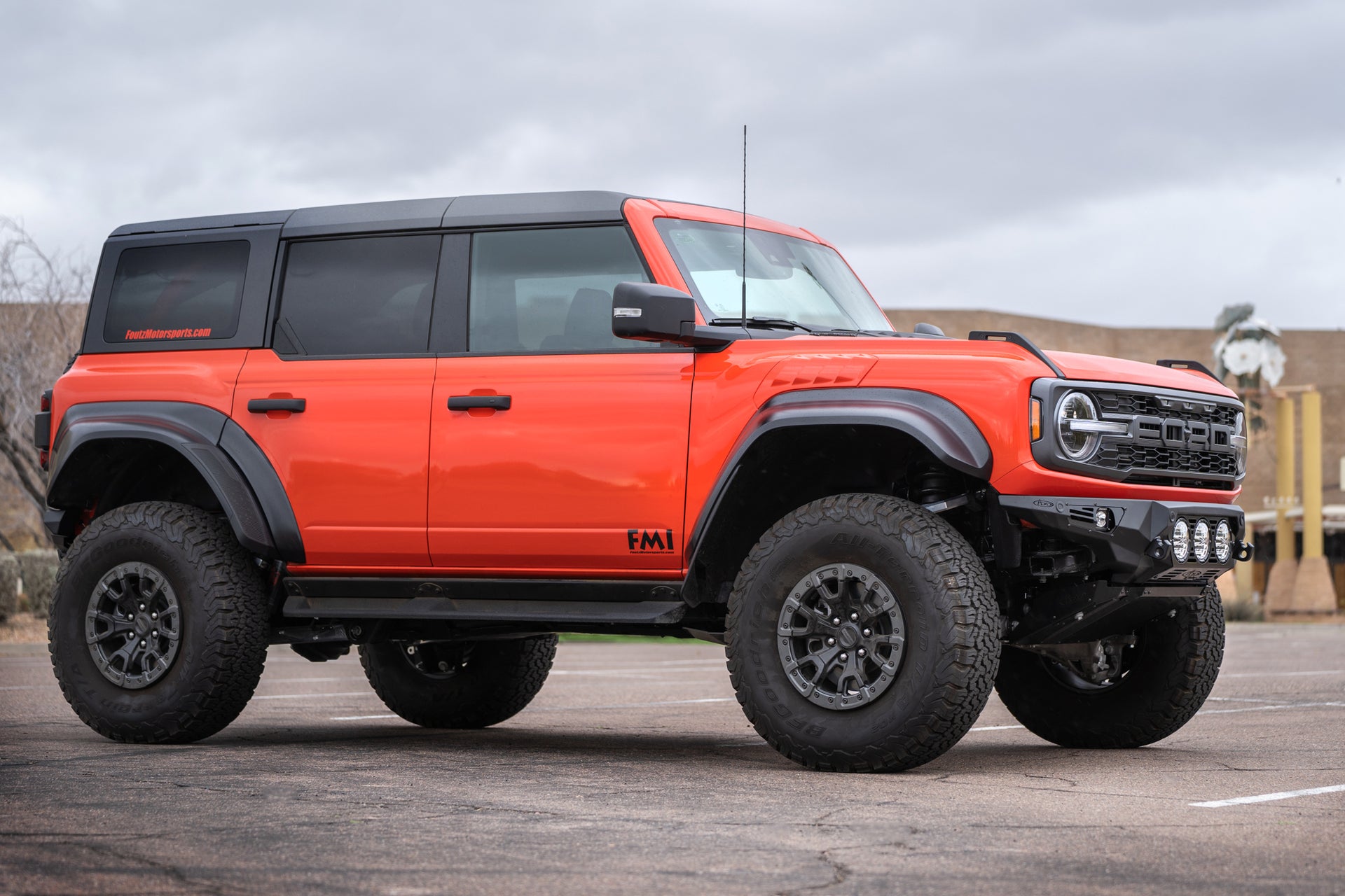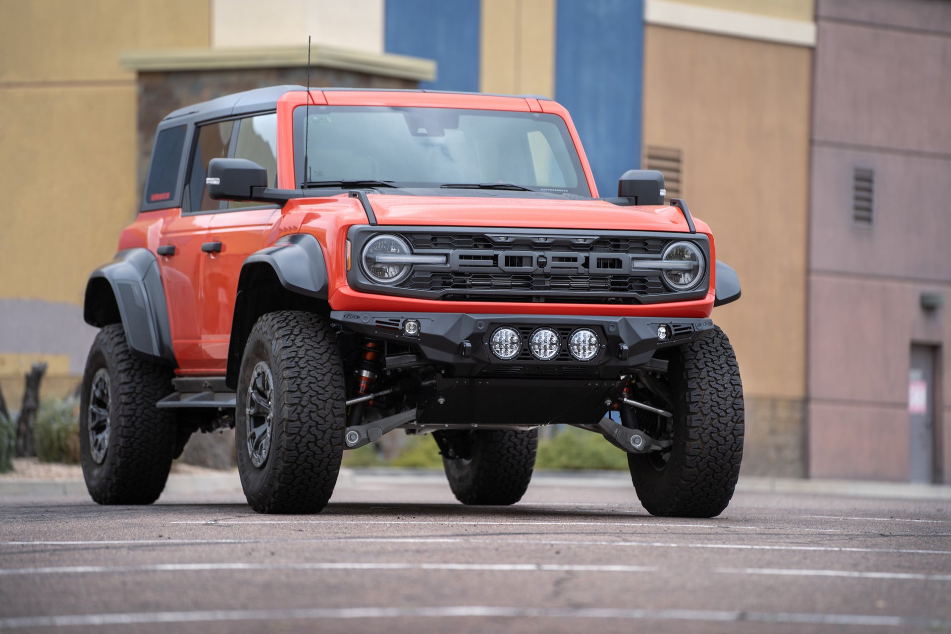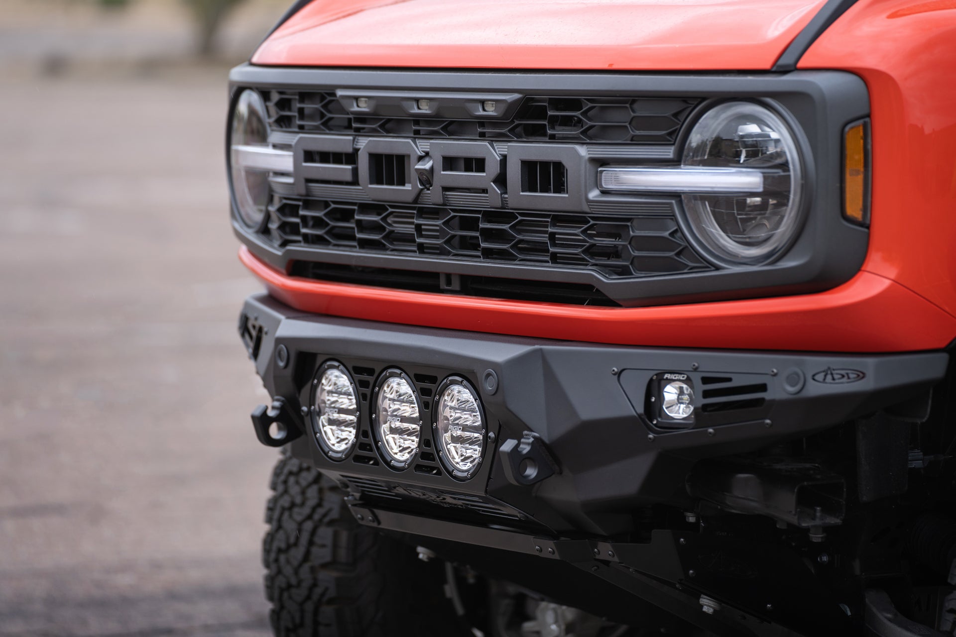 The Bronco Raptor Bomber Front Bumper was designed for those seeking an upgrade from their OEM bumper, without sacrificing any of their vehicle’s functionality. The Bomber can truly elevate the look of your Bronco Raptor, with its tight fit and satin black aluminum panels that frame three mounting points for powerful Rigid Industries 360 round lights. Cube light mounting points are also featured at the sides for added illumination on the trails.