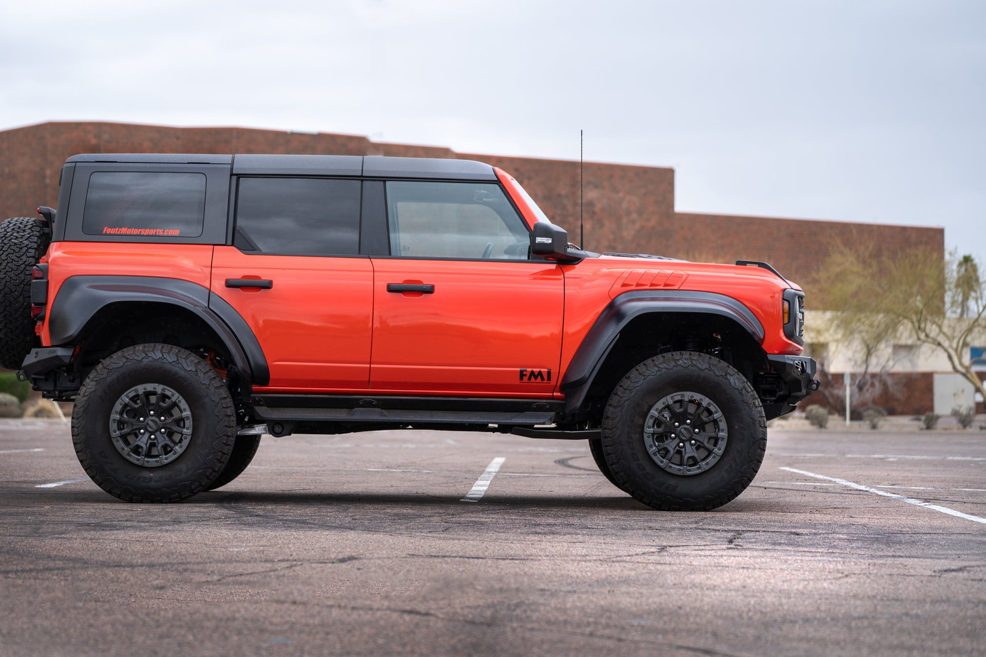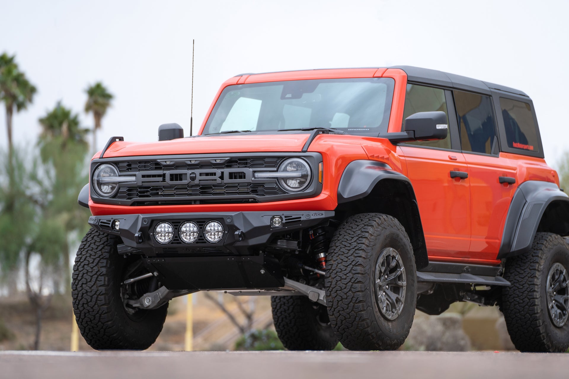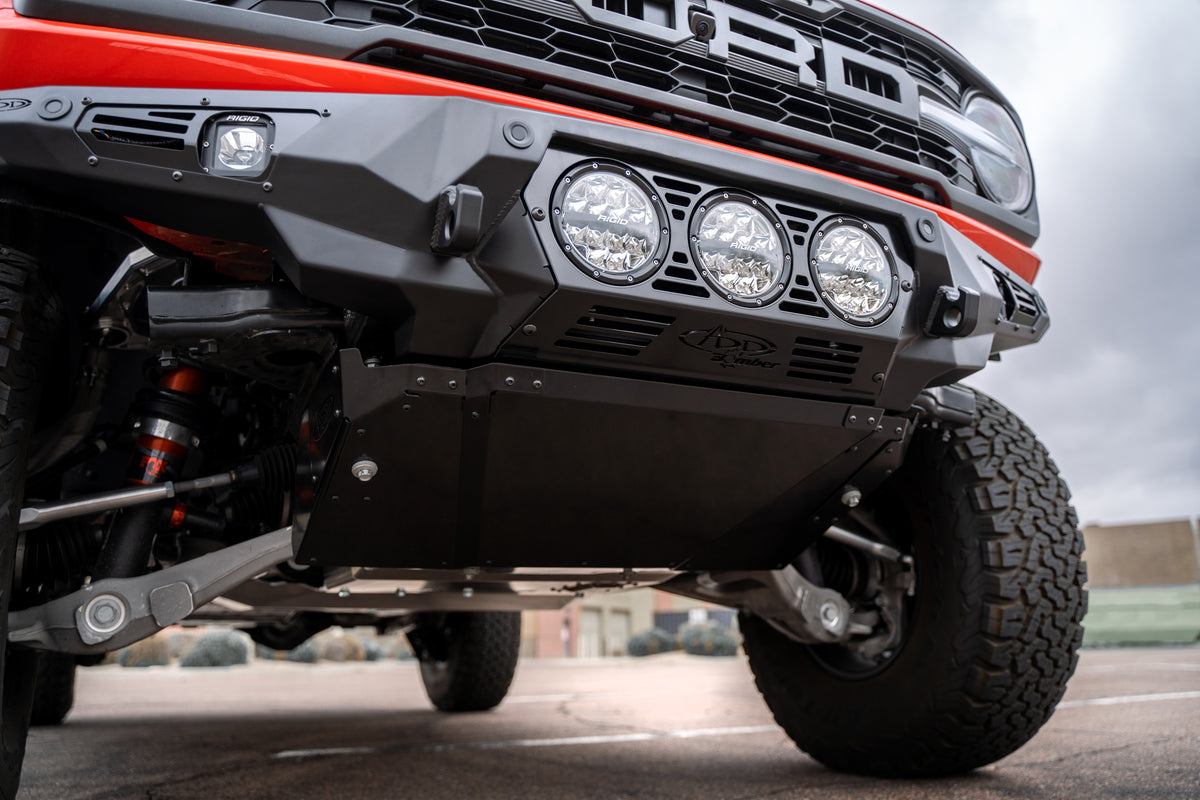 The optional Bomber skid plate matches the style of the bumper, and is a direct replacement to the OEM skid which is not compatible with the Bronco Raptor Bomber bumper.