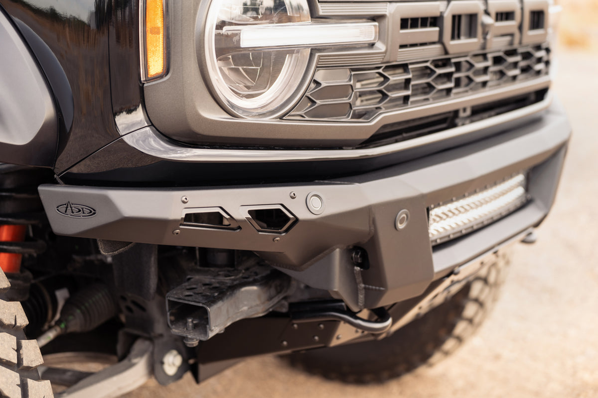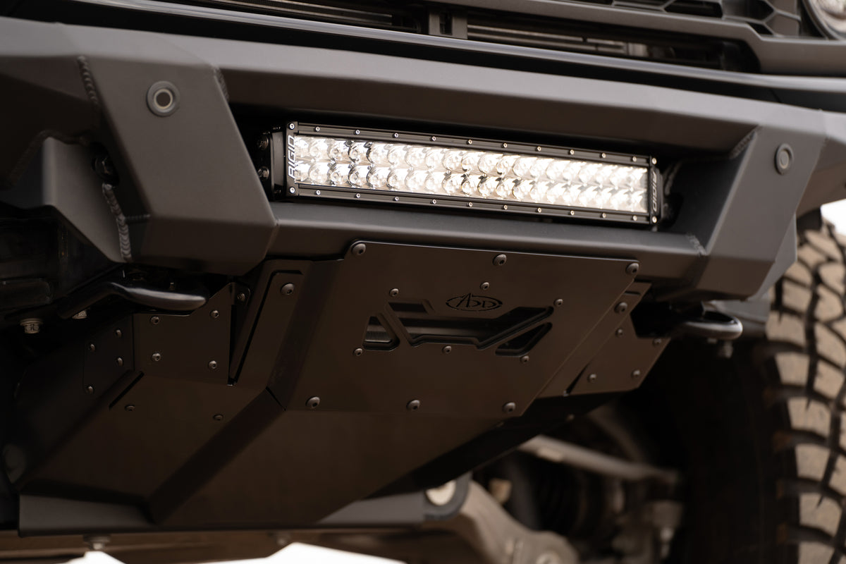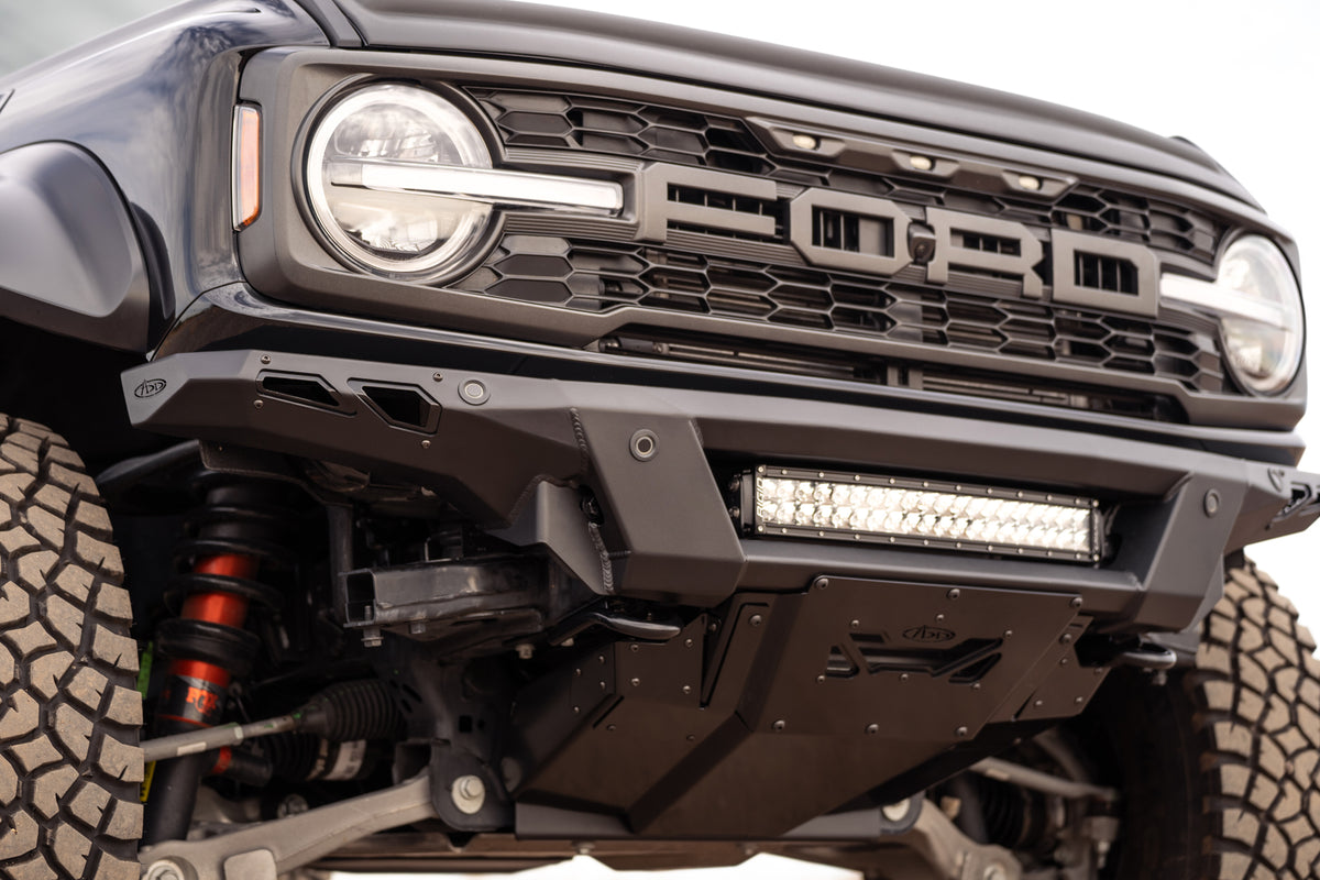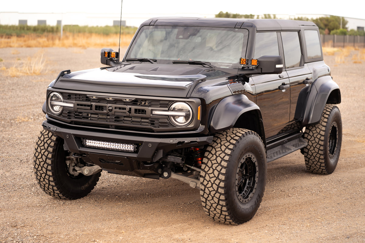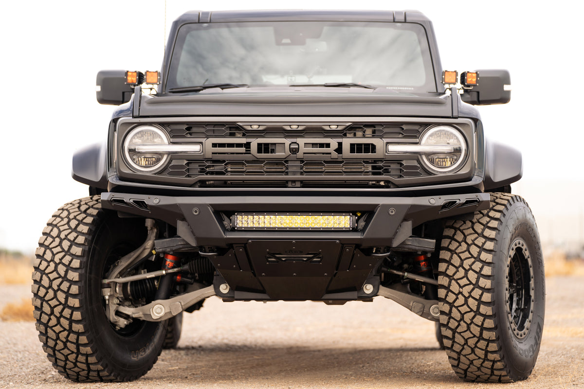 The Phantom Series Bronco Raptor Front Bumper was engineered with a low-profile, knife’s edge design, giving your Raptor an even more aggressive stance than factory. At the center of the bumper is an inset mounting point for a 20-inch Radius LED Light Bar. Alternatively, (5) 3-inch Light Pods can be mounted at this same location. We include a heavy duty 3/16-inch aluminum front skid plate, which replaces the incompatible factory skid. The skid plate and accent panels are finished in a satin black powder coat, while the bumper is finished in a durable hammer black powder coat.