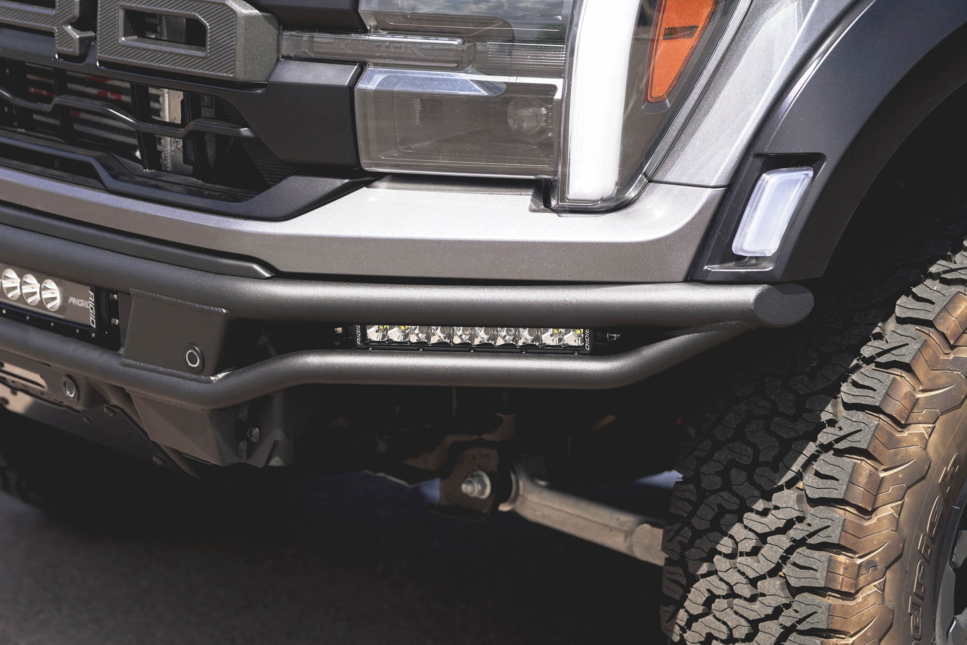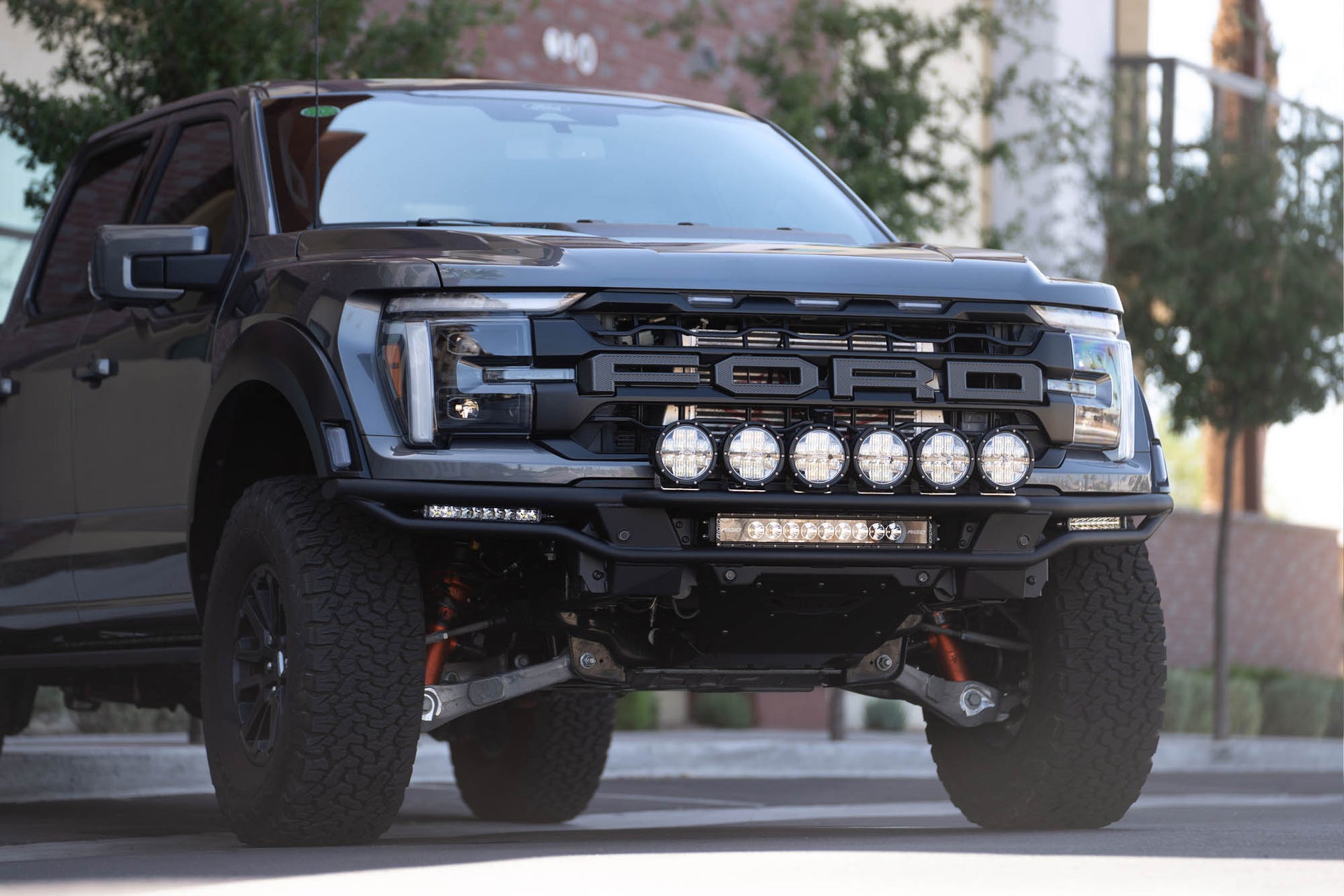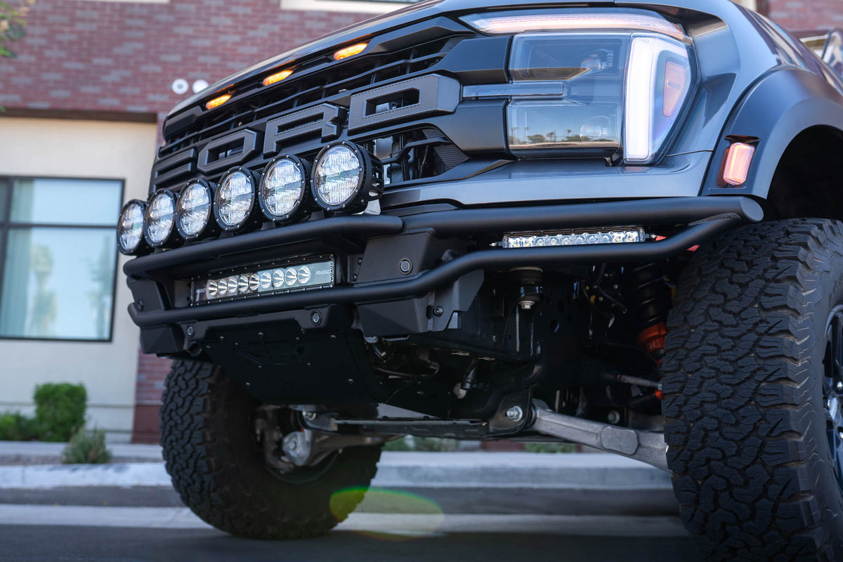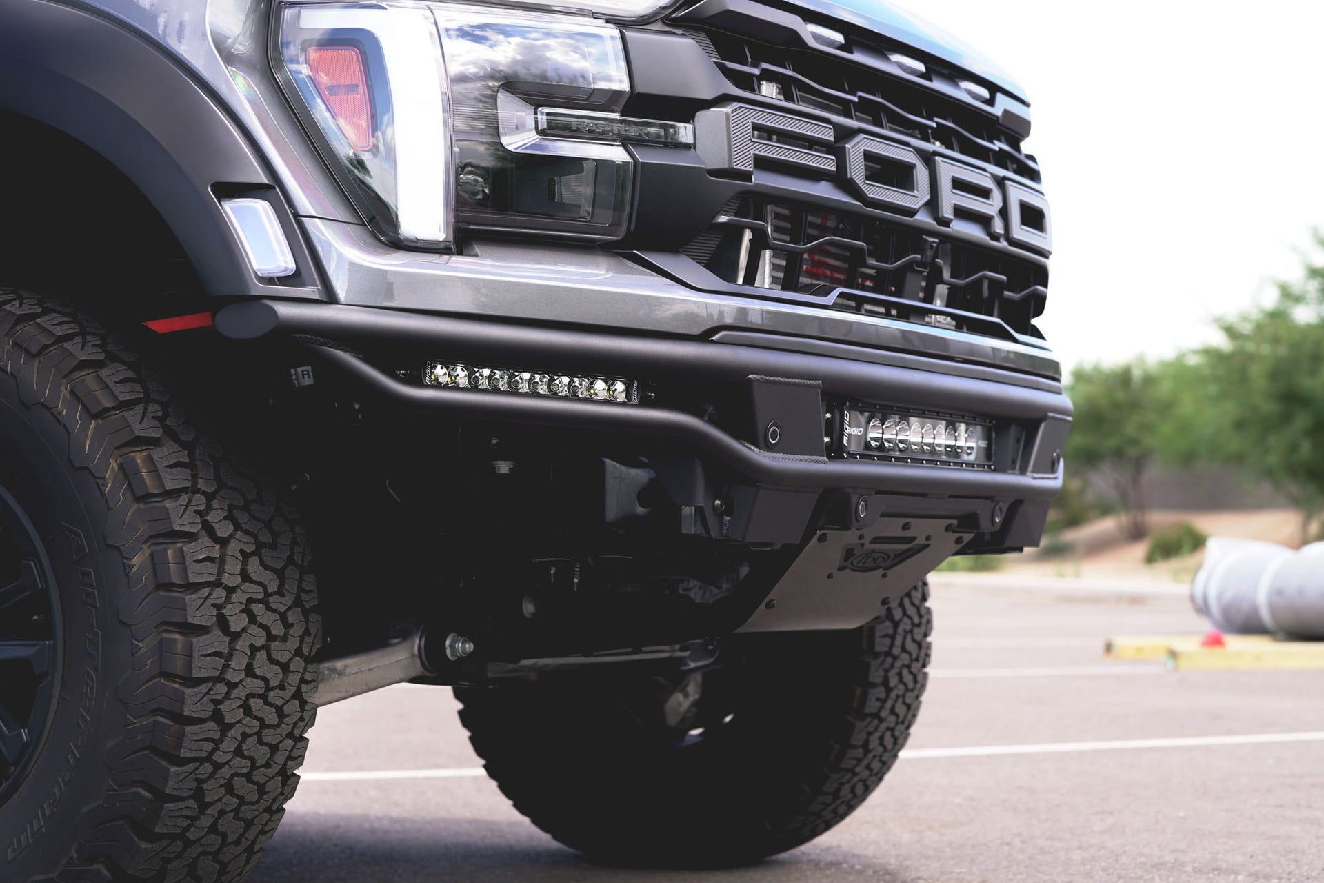 Our F-150 Raptor Race Series Front Bumper features an aggressive tubular build with a low-profile design inspired by desert racing. The top tube is radiused and closely follows the front body line. With higher clearance you can avoid taller off-road obstacles, especially when traveling at faster speeds. The center dual row 20-inch light bar mount and two side single row 10-inch light bar mounts improve trail lighting when in dark or dusty conditions. The included 1/8-inch aluminum skid plate provides additional protection to the front underbody of your truck and is finished with a durable satin black powder coat.