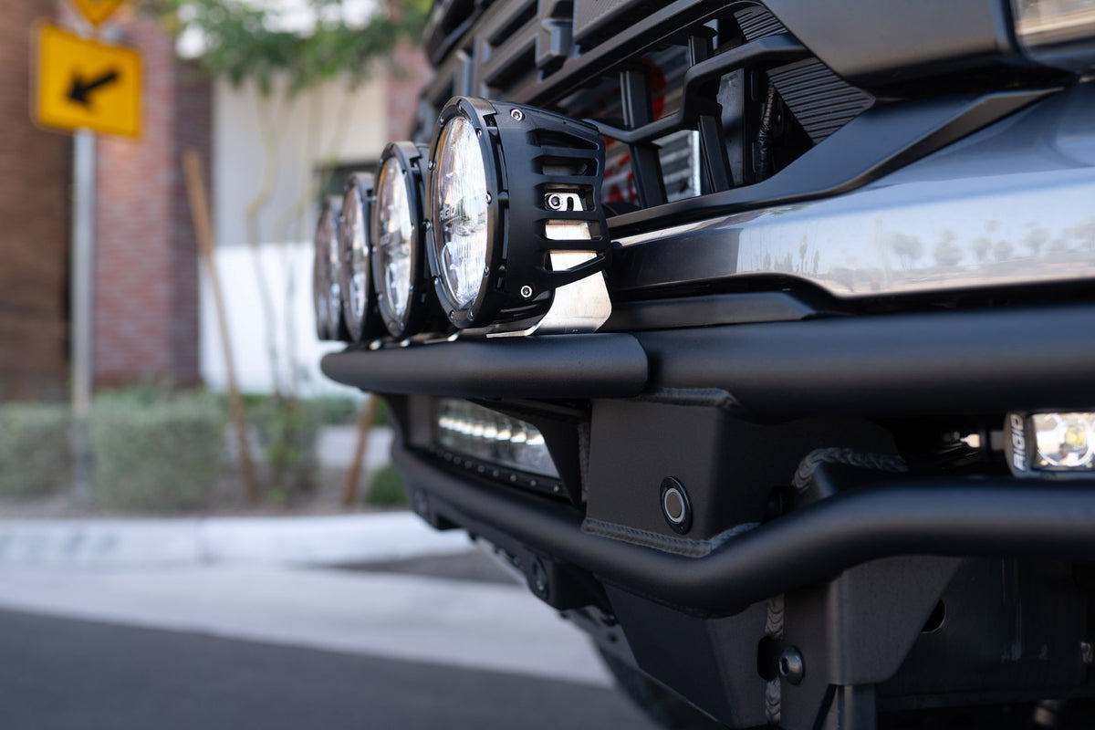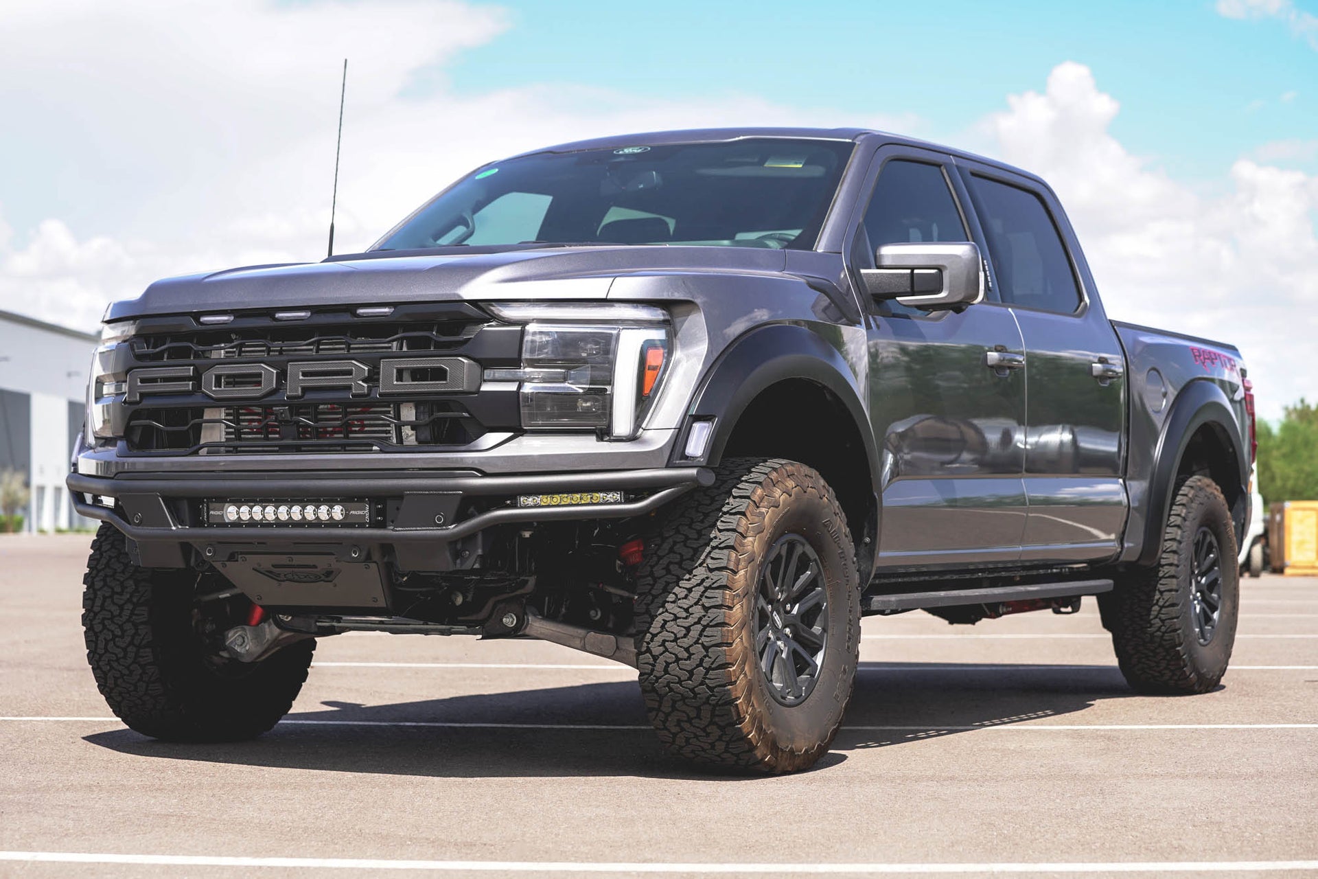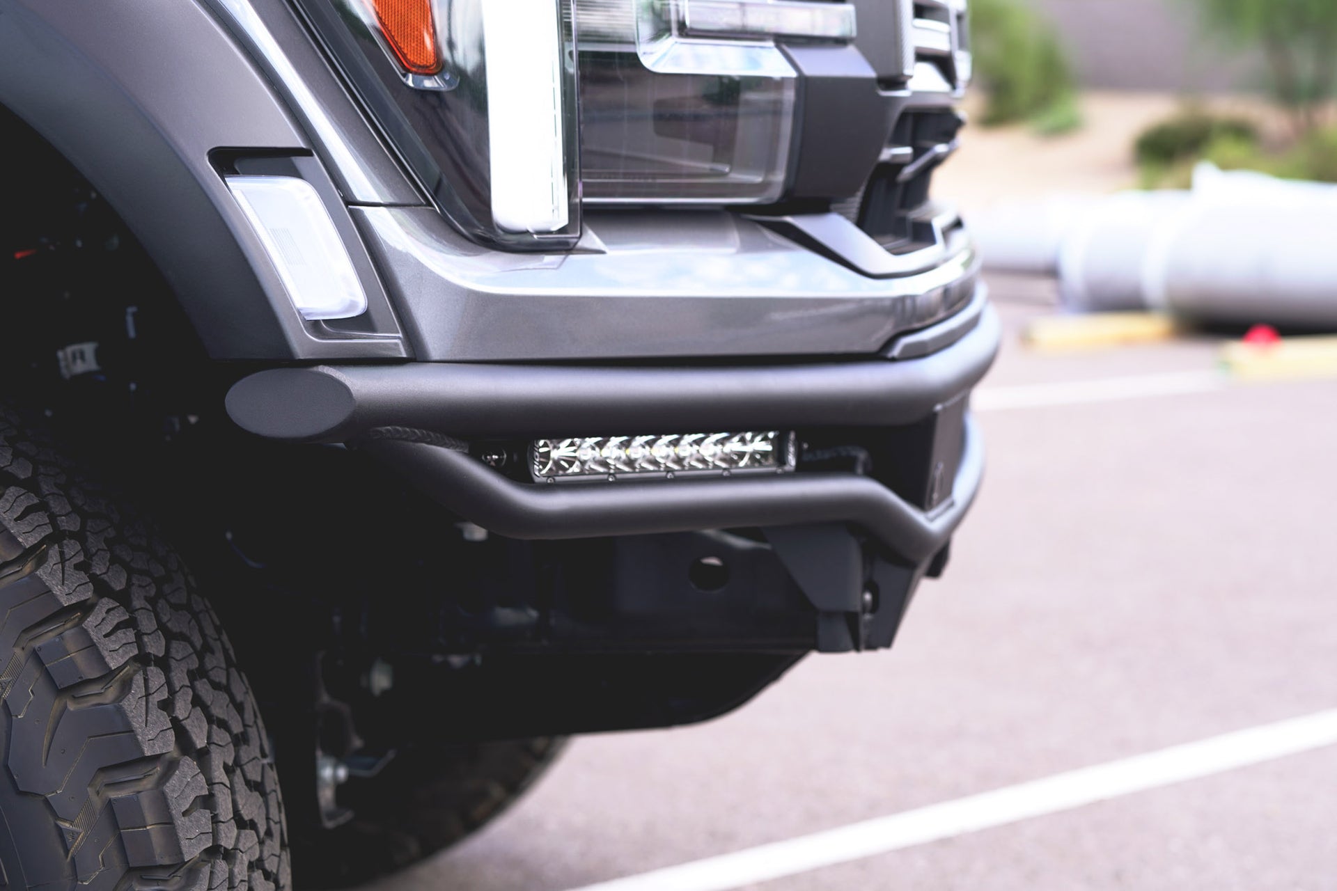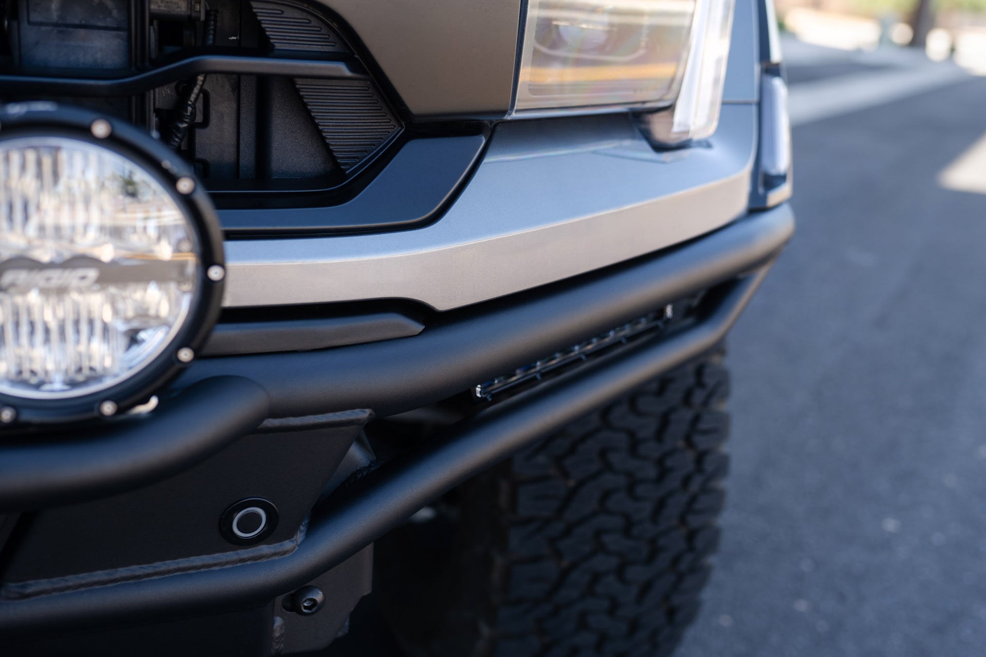 Our F-150 Raptor Race Series Front Bumper features an aggressive tubular build with a low-profile design inspired by desert racing. The top tube is radiused and closely follows the front body line. With higher clearance you can avoid taller off-road obstacles, especially when traveling at faster speeds. The center dual row 20-inch light bar mount and two side single row 10-inch light bar mounts improve trail lighting when in dark or dusty conditions. The included 1/8-inch aluminum skid plate provides additional protection to the front underbody of your truck and is finished with a durable satin black powder coat.