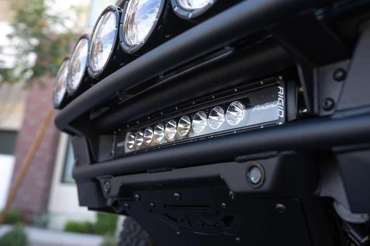 The Race Series front bumper comes with mounting points to hold a 20" dual row center light bar and two 10" single row light bars. With the addition of our light hoop there are many more options, which we cover under "Optional Light Bar".