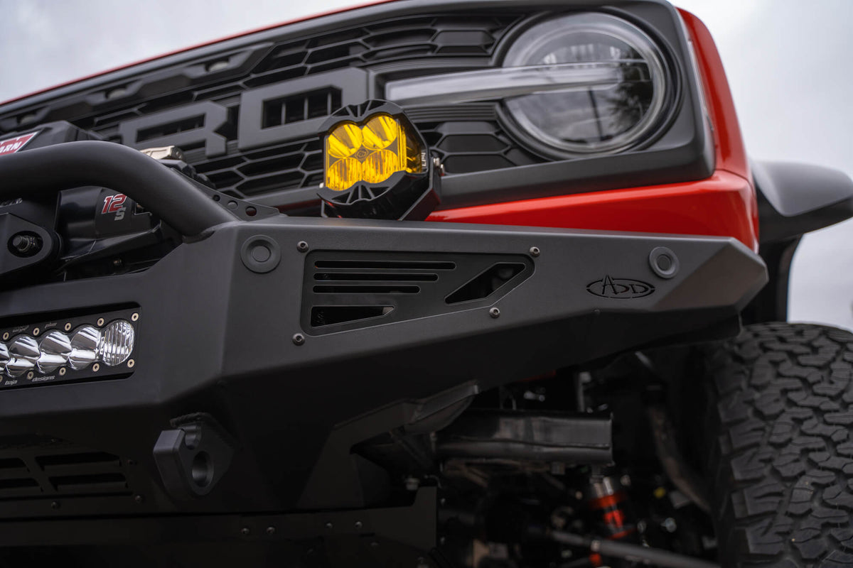 The Rock Fighter Bronco Raptor Front Bumper is designed specifically for edge-of-your-seat, heart-pounding off-road driving. Crafted with heavy trail use in mind, the bumper provides high clearance and approach angles for greater maneuverability over rough terrain. It features a center universal light mount to accommodate up to a 20-inch radius LED light bar or 5 cube lights. Included is a vented bumper skid plate that allows air to flow freely to the intercooler. In addition, it boasts a standard winch mount plus two reinforced clevis mounts for soft shackles to provide recovery options. This was all crafted to flow fluidly with the contours of the Raptor style fender flares. As always, this is fully bolt-on and Made in the USA.
