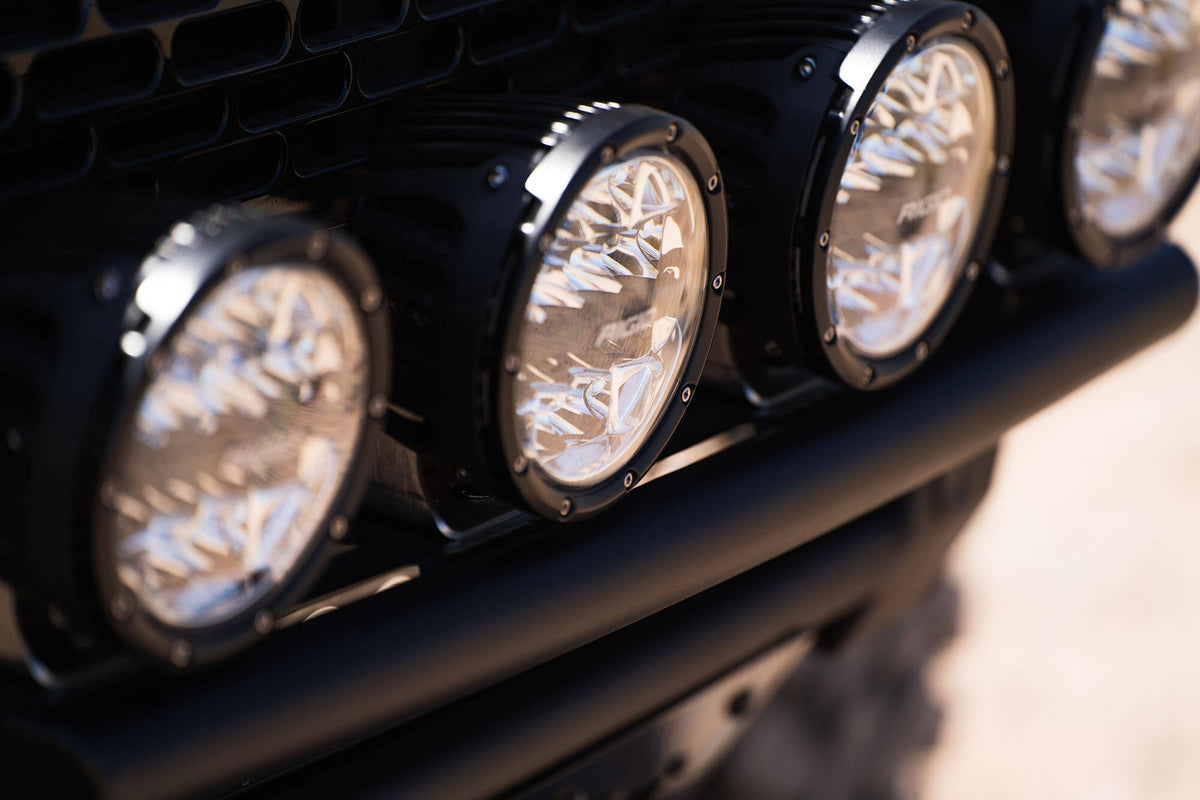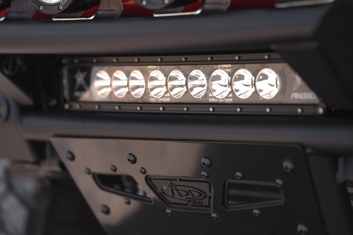 There is an available ADD PRO Bolt-On Light Hoop to maximize visibility on the trail in low-light conditions. This hoop can mount four 6-inch round lights. Manufactured from the same .120-inch steel wall tubing, the hoop maintains the same low-profile fitment as the rest of the bumper. As always, this Bronco bumper is fully bolt-on and Made in America.