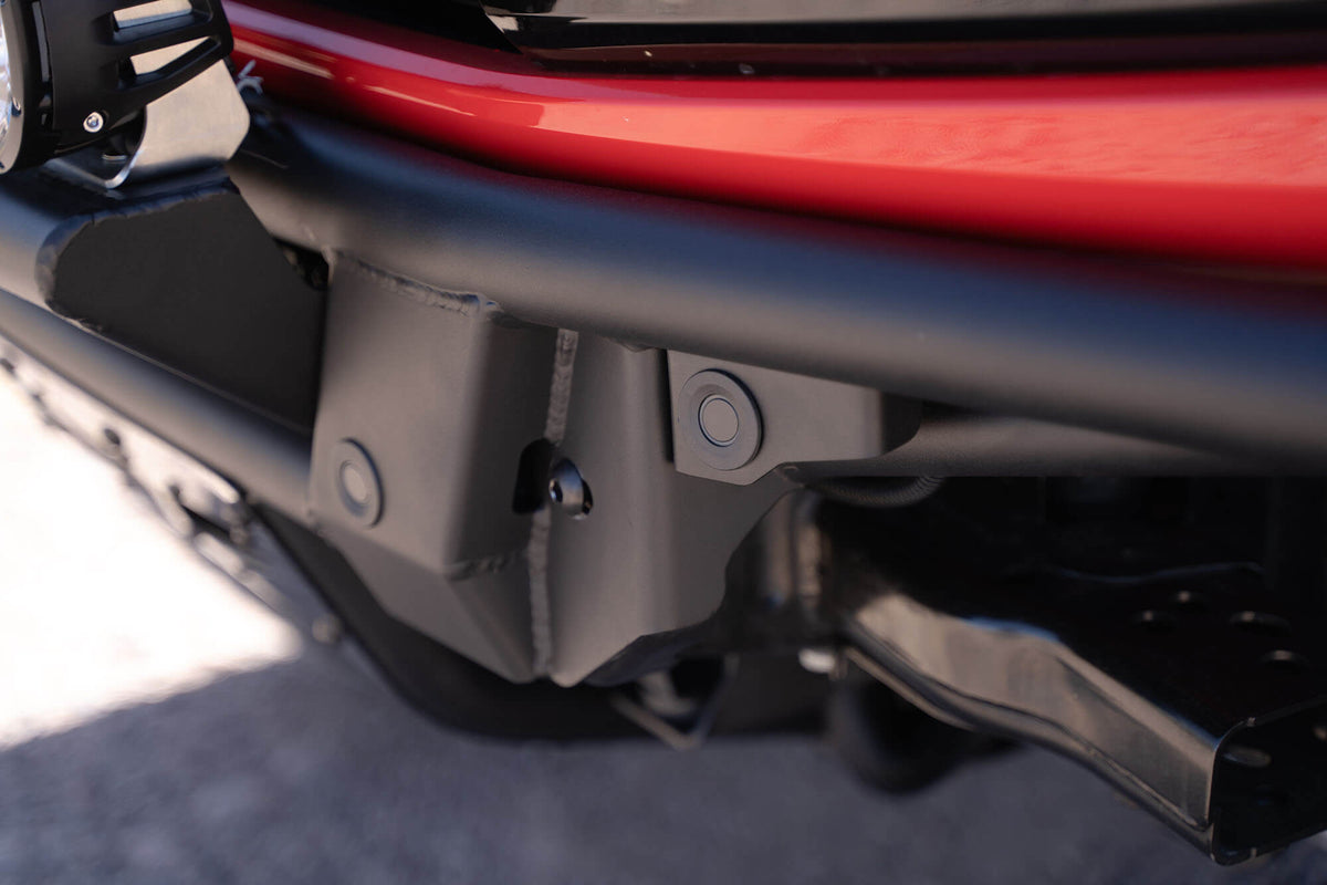 The ADD PRO Bolt-On Front Bumper for the 6th Gen Ford Bronco was designed with the lowest profile fitment possible without having to cut your frame. The upper radius .120-inch wall steel tube tightly follows the contours of the front end, and is joined to steel plating and additional steel tubing at the middle of the bumper. An 1/8-inch vented aluminum skid plate extends towards the undercarriage to provide protection below. The venting in the skid plate ensures proper airflow to the intercooler.