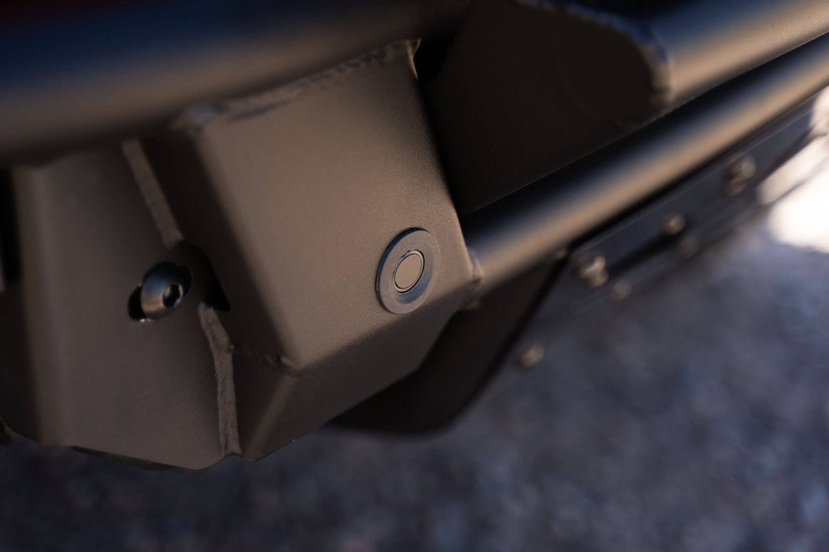Our Pro Bolt-On Bronco Bumper features universal light mounts that can take a 20-inch LED light bar, or 5 cube lights at the center of the bumper. Factory parking sensors are integrated into the design and retain full functionality.