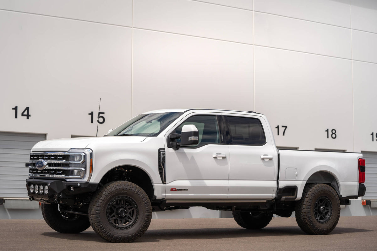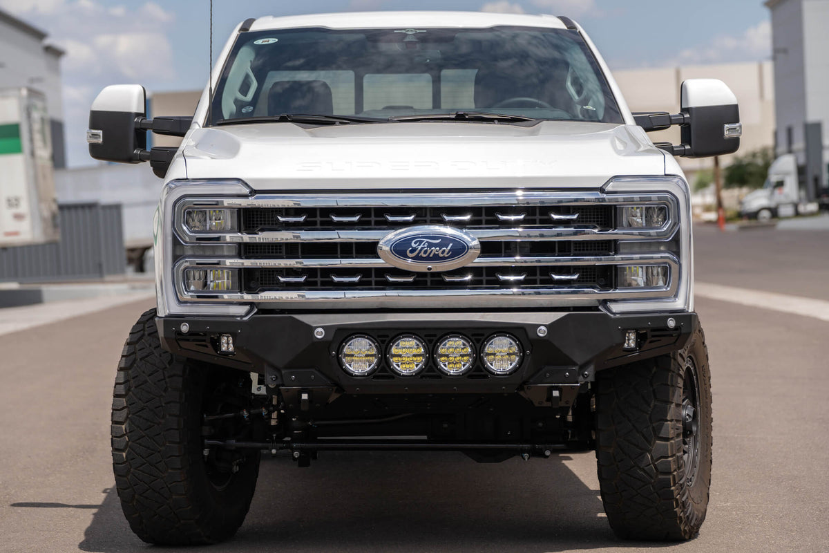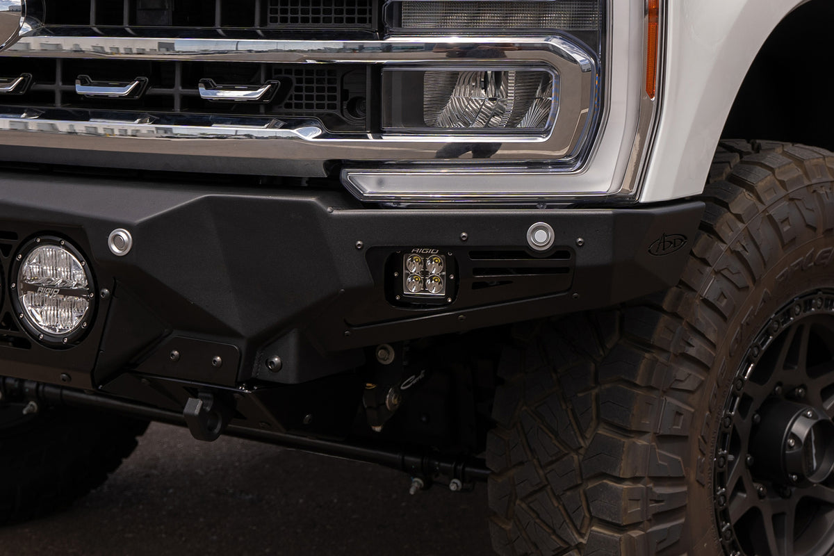 The Bomber Ford Super Duty Front Bumper enhances the style of your truck's front end with its distinctive design. At the center of the bumper, you'll find 4 integrated mounting points designed for Rigid 360 round lights, framed by a sleek satin black aluminum accent plate. Additionally, on each side, there's a dedicated mounting spot tailored for a single 3-inch pod light, such as the Rigid Radiance cube lights, ensuring abundant illumination whether you're on or off the road.